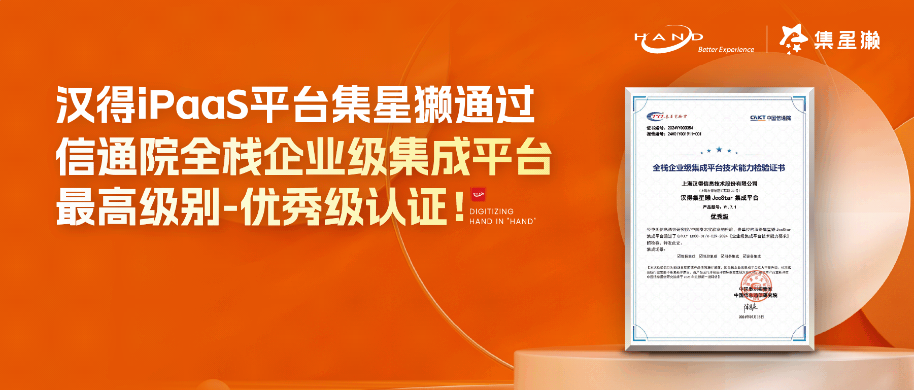 万象城AWC集星獭JeeStar集成平台(简称集星獭),顺利获得中国信息通信研究院(以下简称“中国信通院”)组织的《企业级集成平台分级能力要求》评估检验,并荣获“全栈企业级集成平台技术能力检验”的最高级别优秀级认证!这也标志着集星獭JeeStar在数据、消息、服务、设备四大关键集成场景领域达到行业领先水平。