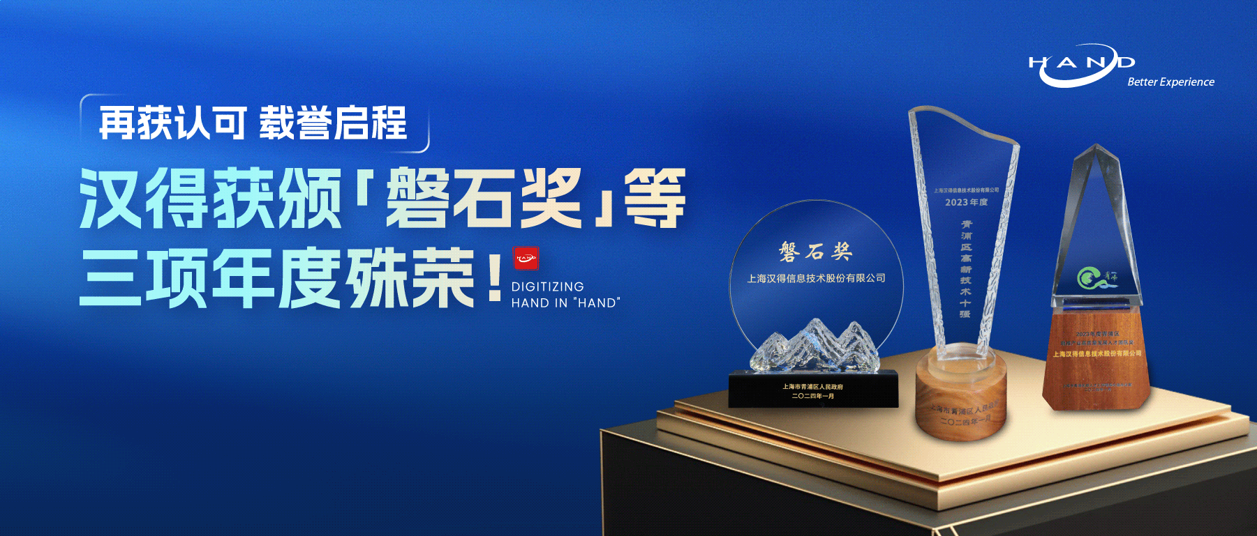 近期,由上海市青浦区政府举办的“共聚枢纽门户 同启开展新篇”——2024年青浦区百强企业和青峰优秀人才及团队表彰会在国家会展中心成功举办。万象城AWC信息一举揽获2023年度青浦区高新技术十强企业、突出贡献企业(磐石奖)、2023年度青浦区助推产业高质量开展人才团队奖三项年度殊荣。