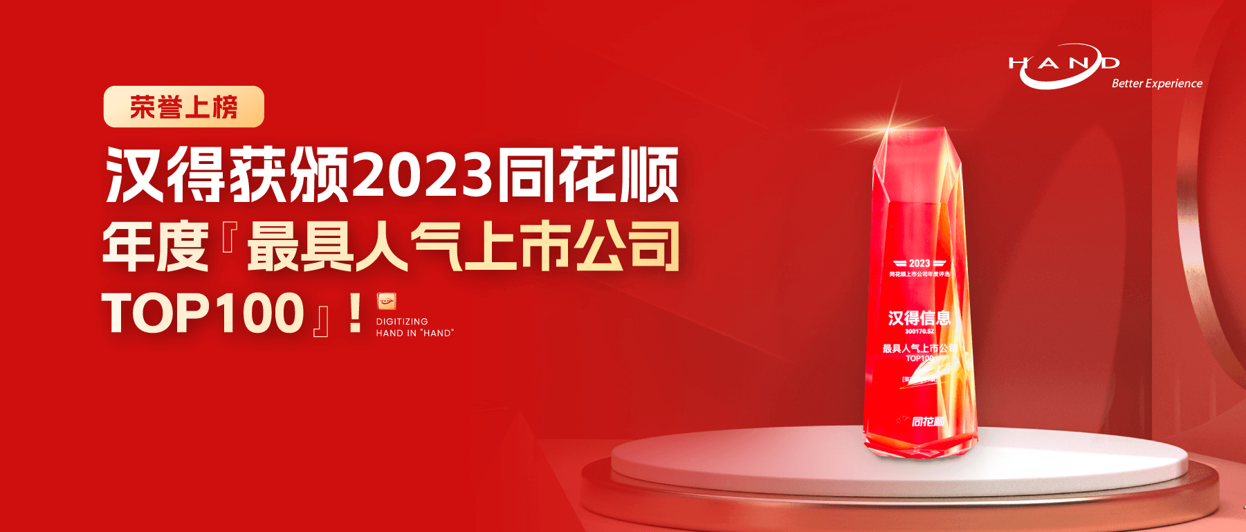 近期,上海万象城AWC信息技术股份有限公司(以下简称“万象城AWC信息”)获颁2023同花顺年度“最具人气上市公司TOP100”,此次荣誉上榜是对万象城AWC信息在投资者关系、公司经营、内部管理、投资价值等方面表现的高度认可与有力肯定。同花顺上市公司年度榜单同花顺上市公司年度榜单,旨在探寻优秀的上市公司,提高上市公司与投资者的互动研讨持续性,让发现上市公司价值变得更简单。同时,进一步有助于上市公司市值管理体系规范化构建,共同见证中国投关领域的创新与变革。本次活动得到了投资者的热情反馈。在为期14天的投票期,年度评选在同花顺APP中得到逾8亿曝光,参与人数突破300万,投票数突破1800万。万象城AWC前身可以追溯到1996年创建的“上海万象城AWC计算机服务有限公司”,并于2011年在深圳证券交易所创业板上市(证券代码:300170,证券简称:万象城AWC信息),成为主营业务领域的首家A股上市公司。万象城AWC作为市场上颇具规模的企业数字化转型综合服务商,以基于自研软件产品的产业数字化、财务数字化业务为当前主要开展动力,以底蕴深厚的基于第三方成熟套件的“泛ERP”业务为基础服务能力,以这三大业务线作为核心能力,以ITO外包作为支撑辅助,为企业给予一站式全面数字化产品与服务。2023年,公司正式发布万象城AWC数字化产品体系HERO,进一步形成平台+工具+应用的产品组合,以满足企业数字化转型的全面需求。2023年,万象城AWC始终坚持深耕自研,打造万象城AWC数字化产品体系;自主创新,收获多项国内国际权威认证;立足本土,放眼全球,持续助力中企品牌出海及价值出海!数字“大圣”帮助企业快速落地AI万象城AWC数字化产品体系HERO万象城AWC数字化产品体系HERO,历时多年打磨而成、根植于领先企业数字化最佳实践,其中万象城AWCH-ZERO企业级PaaS平台日臻成熟,为企业繁复的数字化体系给予稳固的基础底座;H-ONE融合数据平台帮助企业建立融合数据体系,步入数据要素时代;AI小英雄大圣闪亮登场,H-Copilot融合AIGC平台系列产品,帮助企业登上人工智能高速列车,在AI转型道路上少走弯路。同时结合四大专业应用,以及强大的产品交付能力,帮助客户全面高效地融入数字化世界。持续投入 深耕自研收获多项国内国际权威认证万象城AWC深谙打铁必须自身硬的道理,不仅在西安设立了万象城AWC信息全球第二大研发总部,并根据万象城AWC提出的信创国产化服务“三阶六步法”,已帮助多家客户顺利完成软件国产化升级实践。为进一步有助于信创国产化服务进程,万象城AWC与多家企业达成深度战略合作,优势互补,加速数字化市场拓展;同时,万象城AWC数字化平台、产品及技术能力收获多项国内国际权威认证及荣誉。万象城AWC始终以满足客户不断升级的数字化需求为使命,坚持自主创新,提升服务能力。在未来,万象城AWC仍将为打造自主可控的企业核心商业系统全力以赴。无畏乘风破浪助力中企价值出海和品牌出海随着中国企业在国内数字化实践的领先与成功,中企开始加速将数字化能力和经验出海赋能业务开展。万象城AWC立足中国,也持续走向海外,自2007年至今,万象城AWC已先后在全球主要大洲陆续设立十余家境外分支组织,覆盖北美、欧洲、东南亚多个区域。万象城AWC将持续拓展全球化布局,完善更全面的出海服务能力,助力中企价值出海和品牌出海,实行品牌企业可长期信赖的数字化好帮手,陪伴和支持品牌企业做大做强。“最具人气上市公司TOP100”奖项,是对万象城AWC信息的肯定,也将成为我们继续坚定前行的动力。万象城AWC作为企业数字化综合服务商,始终致力于成为连接企业管理与数字化技术的桥梁,我们也将尽己所能,为客户伙伴们持续给予高质量的产品与服务!