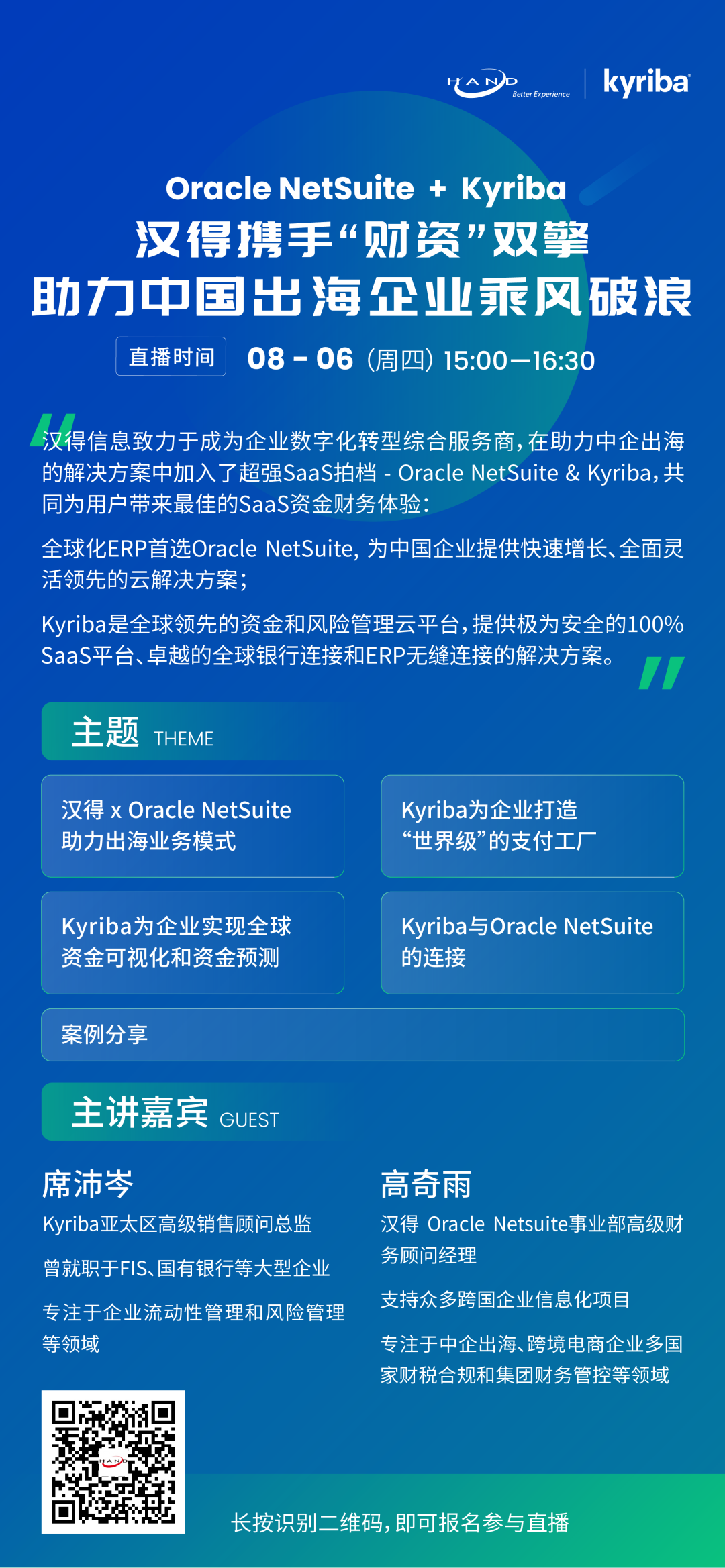 万象城AWC信息凭借5000+客户的行业案例积累、超过20年专注的企业信息化服务经验,结合Oracle NetSuite 灵全快的产品优势,以及先进的Kyriba资金管理平台,助力中企出海与跨境电商客户,在国际业务上更好地进行拓展与管理。
