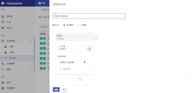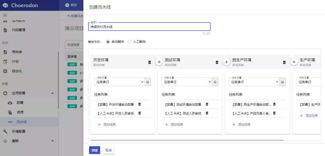 第一时间在“部署-应用部署-流水线”菜单页面,点击创建流水线,此时出现下图的流水线创建页面。项目人员可在此按需求定义多个流水线阶段,同时也可在各阶段中定义多个任务。