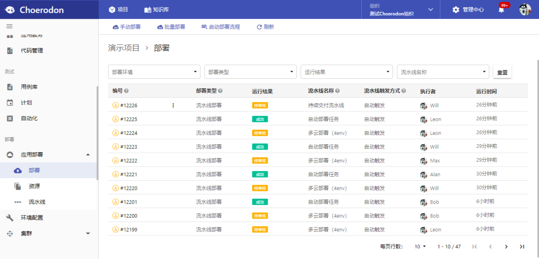 在“应用部署-部署”菜单页面,项目人员能在列表中查看到流水线部署记录的编号、对应的流水线名称、触发方式、执行者、运行时间以及运行结果;现在,运行结果存在以下几种情况: