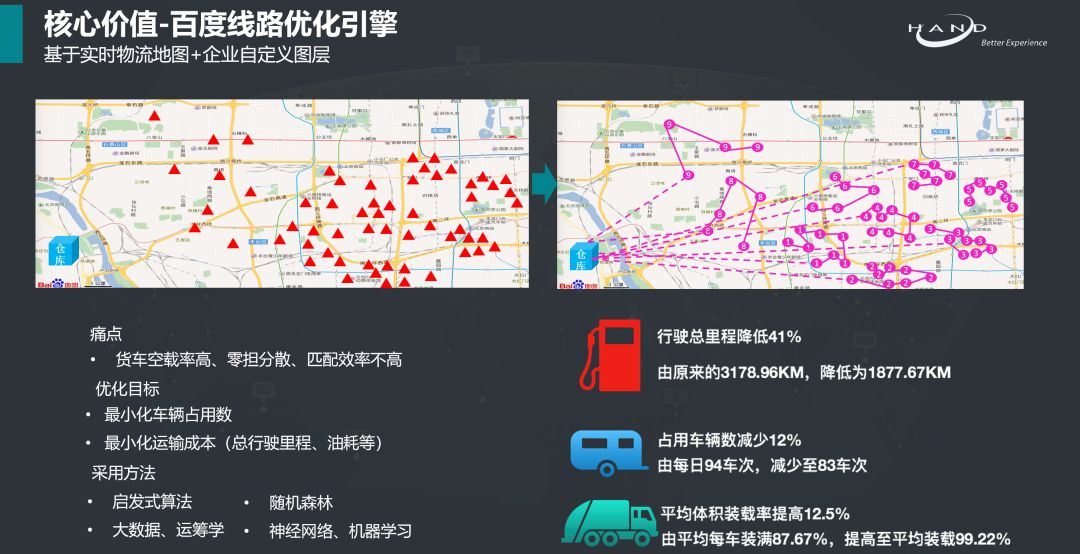 万象城AWC HTMS 与百度物流地图+智能调度 ROS 的 AI 能力相结合,实现满足企业排单排线、路径规划等需求,适用于单点提多点送、多点提多点送等复杂业务场景。在满足物流配送时效的前提下,为企业在调度运算时间、单车满载率、行驶里程、车辆数等方面,实现效率提升与成本节约。
