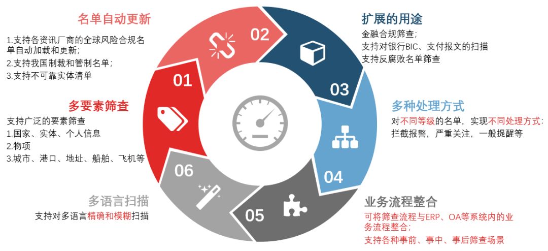 同时,基于多年来在制裁合规领域积累的行业经验和筛查模型,系统可以帮助企业自动比对各类业务要素。一旦筛查命中客户(涉恐、涉制裁、资金冻结等名单)、物项(军品、两用物项、禁运物品)、运送方式(船舶、商用飞机)、地域(高风险国家、禁运地区)、路线(涉制裁港口)等具体黑名单内容,系统将自动产生警报或继续将警报提示嵌入相关业务流程以便进行风险控制。