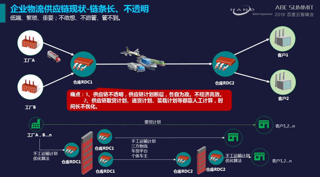 这里举个例子:“比如仓库里的货没有按时发出去,这时候我们的物流大脑就要去运算出来,它在什么时间发,可以赶得上预定的进度,或者它如果发不出去,过了这个时间我们会有怎样的备用策略,整个后端供应链的计划时效都需要改变,这才是我们企业要去做的事情。