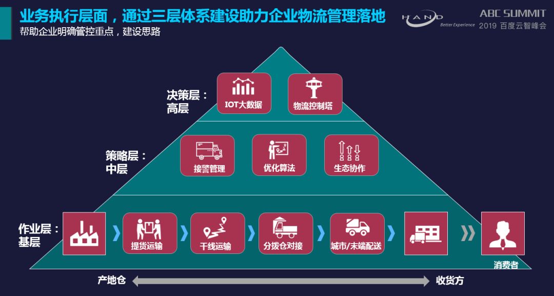 在业务执行层面 ,万象城AWC根据多年的项目实施经验,顺利获得打通&服务企业上中下三层体系建设:作业层(基层人员);策略层(中层管理);决策层(企业高层),助力企业物流管理落地。作业层管理整个供应链链条数据,策略层由中层制定每个节点之间的关联关系,确定业务策略,驱动基层进行高度协同作业、集中管控、预警处理等,最后在决策层帮助企业高层实现企业控制塔,支持企业高层进行智能决策。