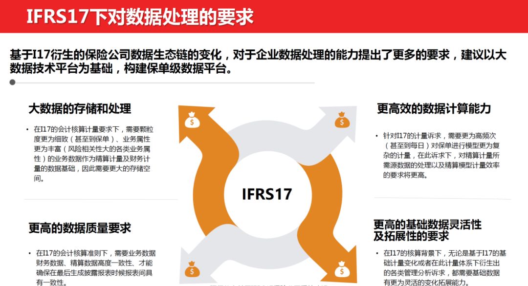 以上方案建议,基于综合的企业级数据管理平台,满足了交易级数据的计算和存储;满足了IFRS17要求的精算评估和会计计量时效要求,满足了核算全流程管控的需要。