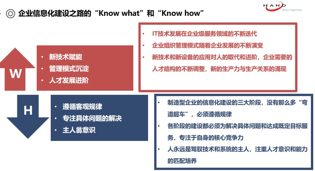 之后她分享了企业信息化建设的规律,从自身经验和积累出发,提炼出企业信息化建设的两点准则:“WHY-为何要信息化”和“HOW-如何建设信息化”。为何要建设信息化,陆嫕颖对此提出三点理由:一是新技术不断涌现,比如IoT、大数据、影像技术的进步都会对我们的工作方式给予革命性变化的可能;二是企业组织的不断革新会对IT的应用提出要求;三是新技术和新设备会对人提出更高的要求。
