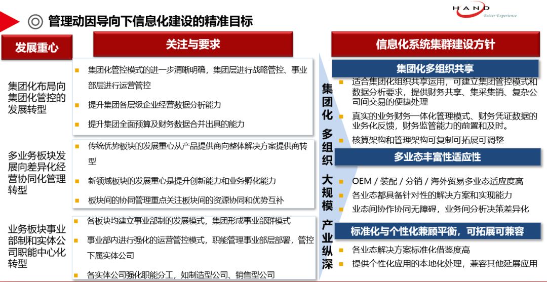 最后,陆嫕颖女士分享了集团化企业应该在信息化建设上关注的重点领域和重点方向,指出在集团层、事业部层和公司层不同层面如何关注自身的核心竞争力,以及如何顺利获得信息化进行赋能。