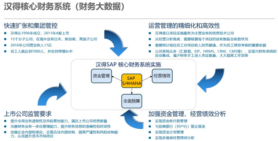 如何更好地履行财务部职责,作为一家IT公司的CFO,沈雁冰先生深知运用IT技术为企业赋能的道理。顺利获得资金管理、绩效分析、全面预算等内容,并统筹到整体的SAP系统中,能够做到整体的管控要求。