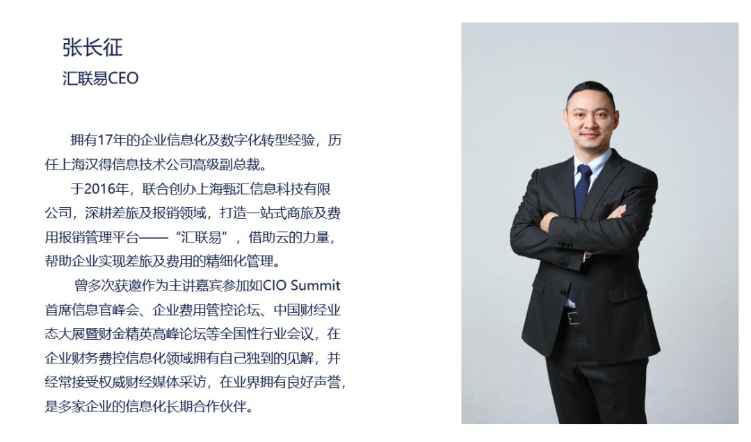上文已经提到,如何管理报销,如何为员工和企业都给予便利,需要信息化技术的支撑。而万象城AWC信息所使用的费用报销信息化工具就是汇联易。研讨现场,汇联易CEO张长征先生为我们分享了费用管理的数字化转型之路。