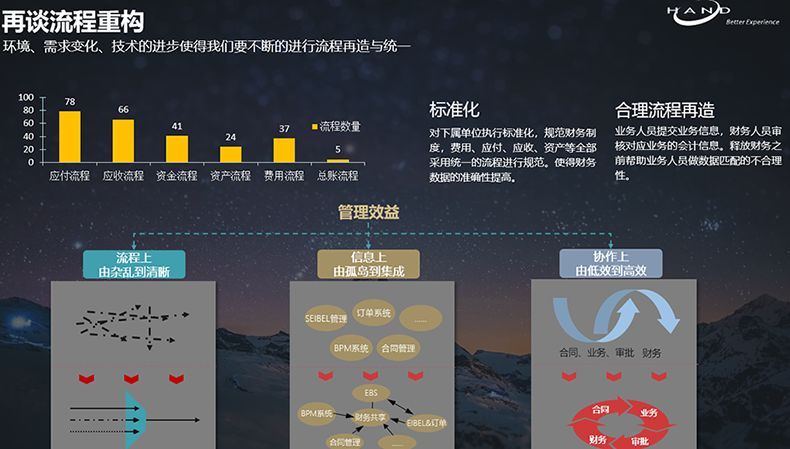 “在集团统一财务职责及政策的基础上,财务共享中心需要将基础的核算业务(包括应收/应付/资金/预算)等全部吸收到共享中心中来,满足集中化核算、快捷化处理的要求。”李雪松先生表示,在转变流程上,需要重新对所有的财务核算相关的业务流程重新梳理打通,进而满足整体标准化及流程再造的要求。