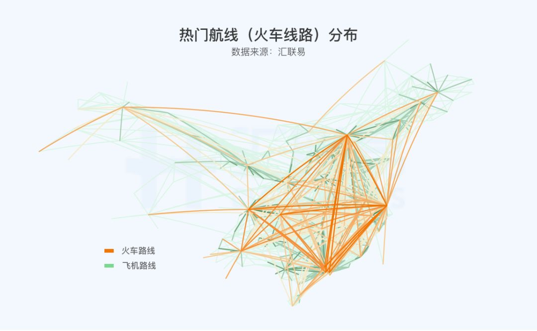 飞机的热门差旅路线为“大十字架”,热门顶点城市以及十字架上的城市彼此联系构成“大钻石”状。其中,最密集的飞机出差路线出现在北京、上海与珠三角之间。