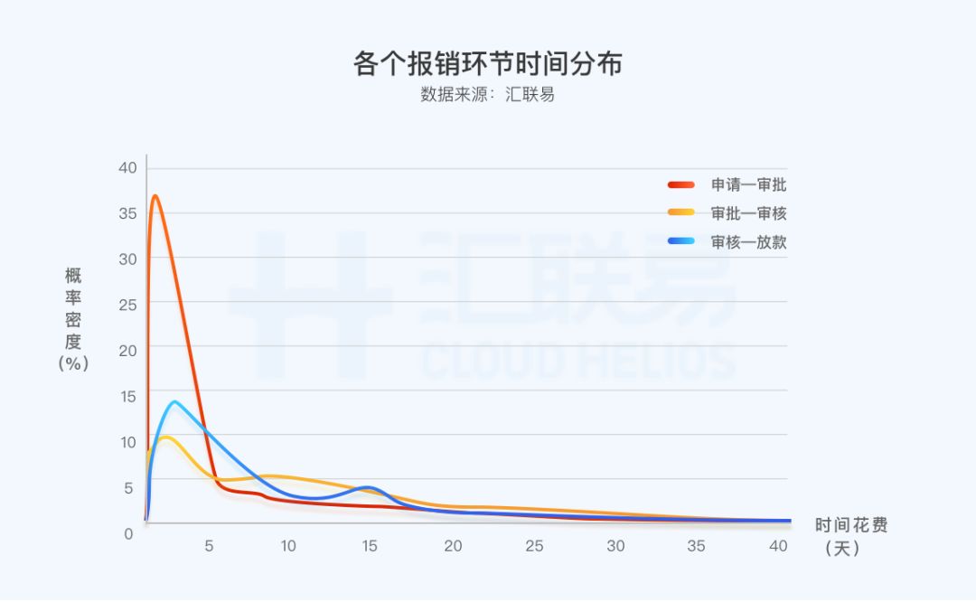 根据汇联易差旅大数据中差旅报销-财务付款的流程时长分析,结合企业的规模得出财务流程耗时分布概率密度图。