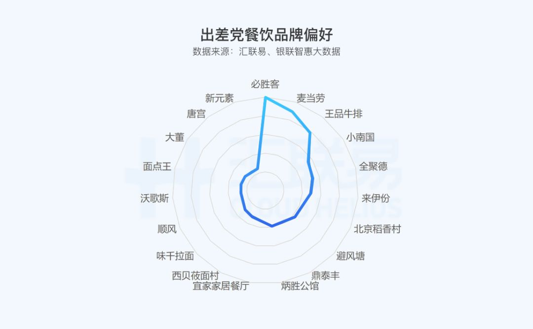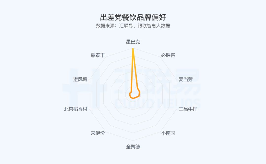 根据银联智惠大数据的消费数据标签匹配,可以从以下几个维度分析出差党的行为特点。出差党最喜欢的几个餐饮品牌:排在第一位的是星巴克,作为临时办公地点与会议地点,拥有无语伦比的优势;差旅人更偏向于去麦当劳与必胜客用工作餐。