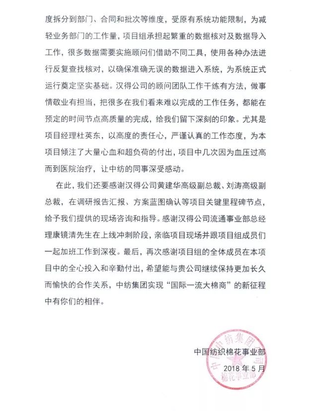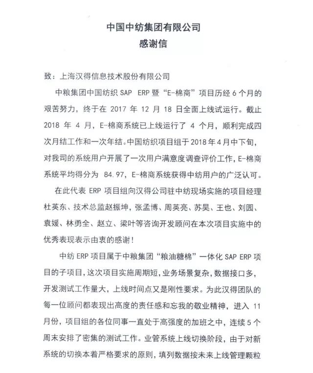 来自中纺集团的感谢信