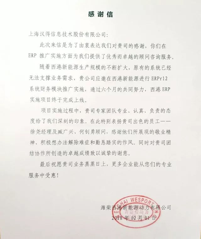 来自西港新能源的感谢信