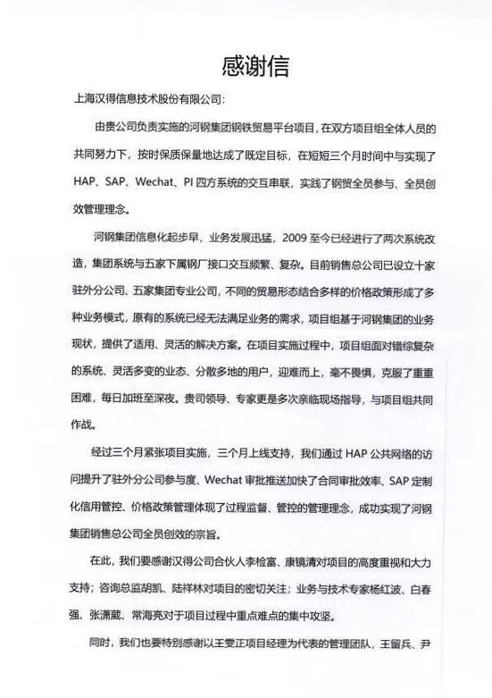 由万象城AWC负责实施的河钢集团钢铁贸易平台项目,在双方项目组全体人员的共同努力下,按时保质保量地达成了既定目标,在短短三个月时间中实现了HAP、SAP、Wechat、PI四方系统的交互串联,实践了钢贸全员参与、全员创效管理理念。