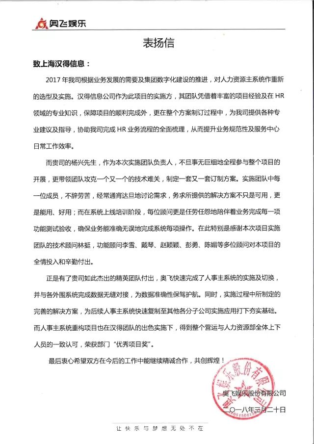 来自奥飞娱乐的感谢信