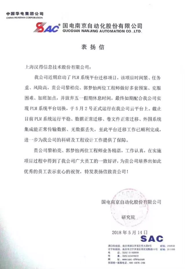 来自国电南自的感谢信