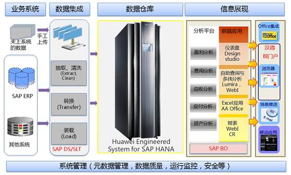 企业财务精细化运营分析平台使用ETL工具将客户财务数据同步到HANA平台,在HANA数据库中已开发好预定义的相关数据模型,比如指标库模型、财务分析模型等,为信息展现层给予快速准确的数据响应。在信息展现层,已顺利获得BO平台开发好相应主题的分析系统,并顺利获得万象城AWCBI门户进行分析系统的展现,同时可以顺利获得万象城AWCBI门户实现对报表、用户、权限的管理。