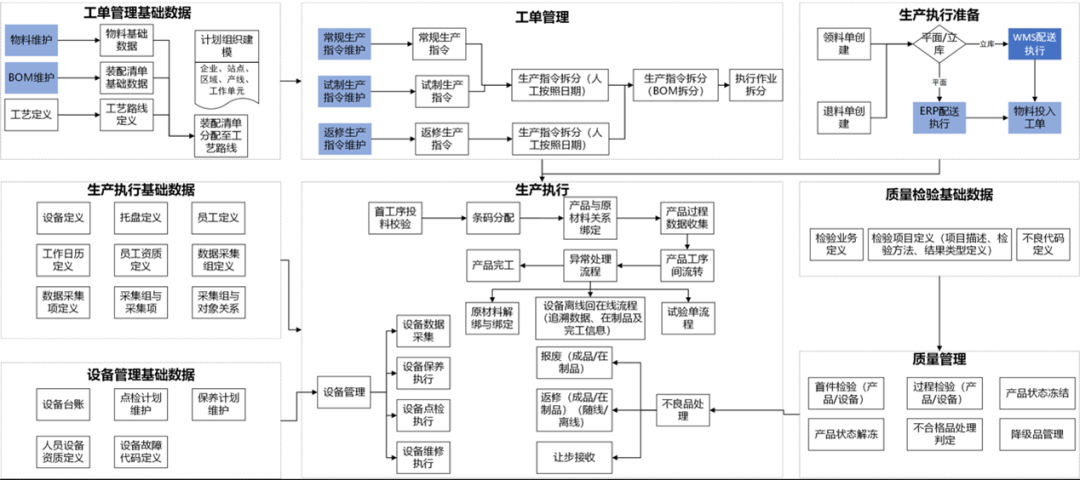 业务流程是从ERP承接生产计划开始。由于每个电芯、模组都是作为独立的管理对象,因此承接的生产指令将被分解为对应唯一一个单体产品的执行作业。产品在线加工实现全自动化的进度跟踪、过程控制和质量追溯,同时针对异常由人工离线处置,辅之以过程中的物料准备、质量管控以及设备管理。