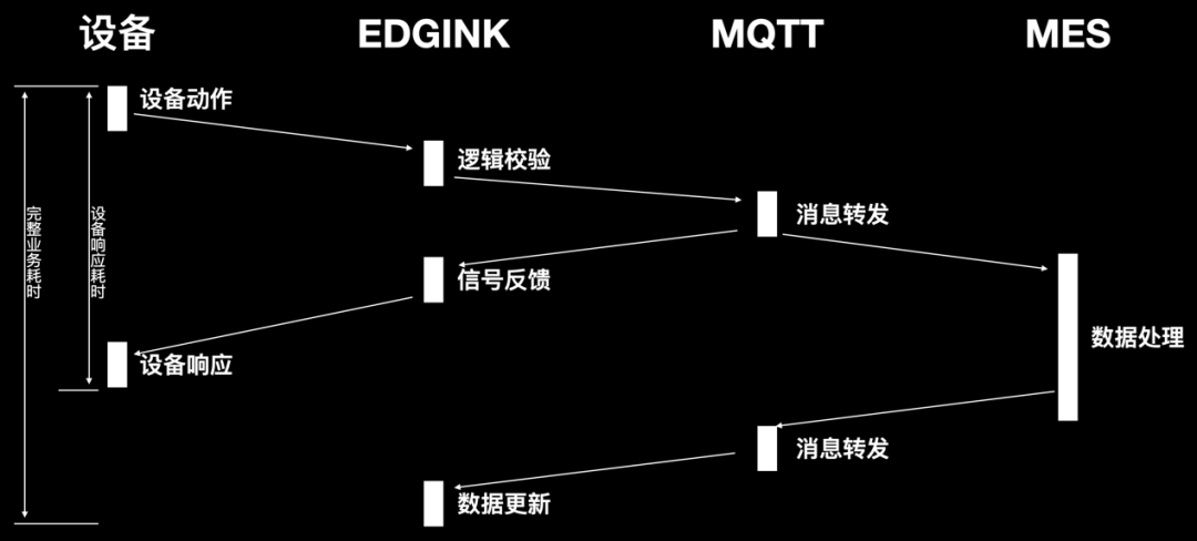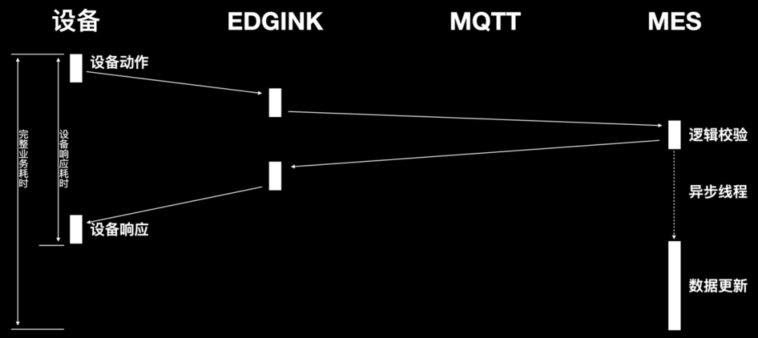 MES处理完成的数据反馈至Edgink超时了,上道工序的完工信息未及时反馈至Edgink导致产品入站下一道工序时无法校验顺利获得。于是我们不得不对方案做调整,尝试将业务逻辑校验完全放在MES。设备端调用Edgink接口,Edgink不做任何处理直接调用MES接口进行逻辑校验,完成后启动异步线程进行数据处理。彻底消除了系统间交互所用的耗时。