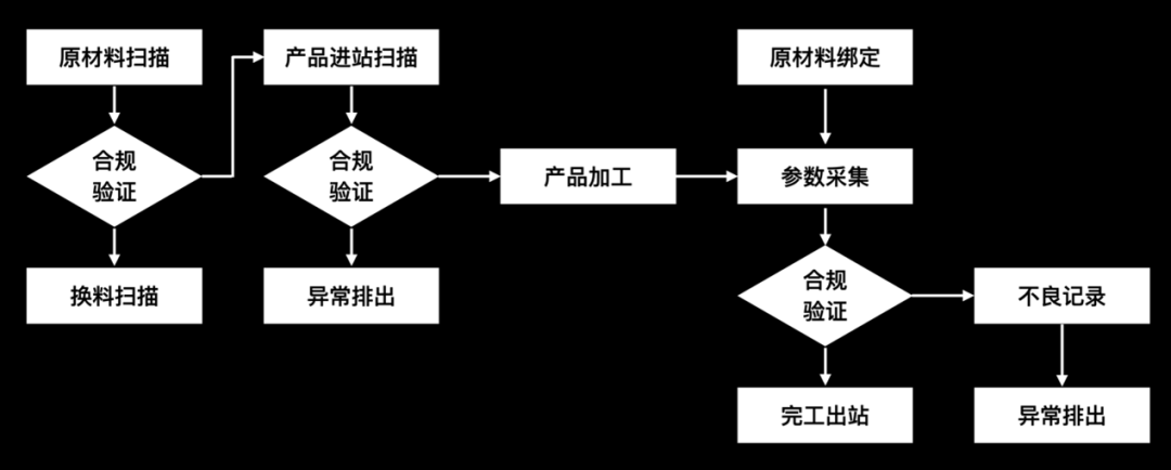 一旦打通了MES和设备的交互,就可以实现产品加工过程中的数据采集和过程控制。产品加工过程常规的控制流程如下图所示。原材料上料时调用MES接口进行原材料合规验证,如保质期、BOM匹配、参数特性等。验证顺利获得后产品方可进站。每道工序进站时需要进行工序合规的判定,验证不顺利获得则顺利获得设备NG槽排出。验证顺利获得设备开始进行加工,此时设备调用MES接口进行原材料装配关系绑定,过程中也会将产品或者设备参数,如产品的电压、内阻或者设备的温度、转速等顺利获得接口发送至MES进行合规性验证,如上下限超标校验。如果出现不良在出站时将被排出进行相应处置。加工完成后设备调用MES接口进行出站记录。