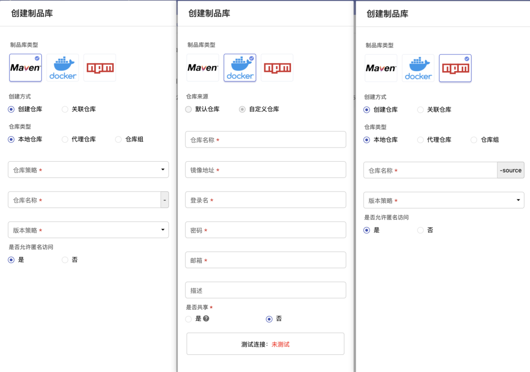 自定义nexus服务功能: 支持添加默认外自己安装的nexus服务。创建maven/npm仓库时,是在对应启用的nexus服务下;