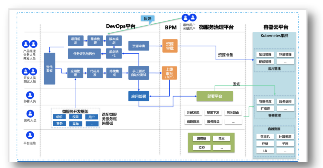 三一集团技术中台以云化底座为基础,以DevOps平台和微服务开发框架为抓手,基于优化的敏捷软件开发管理流程,加上实施敏捷开发的管理工具,最终建立起软件研发自动化管理流水线,促进软件研发效率及质量提升。