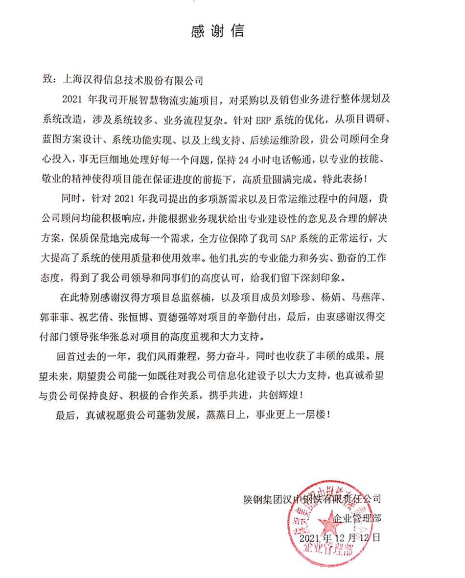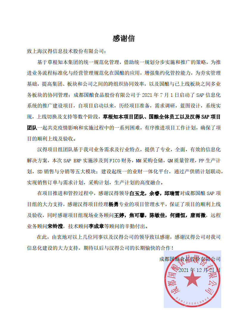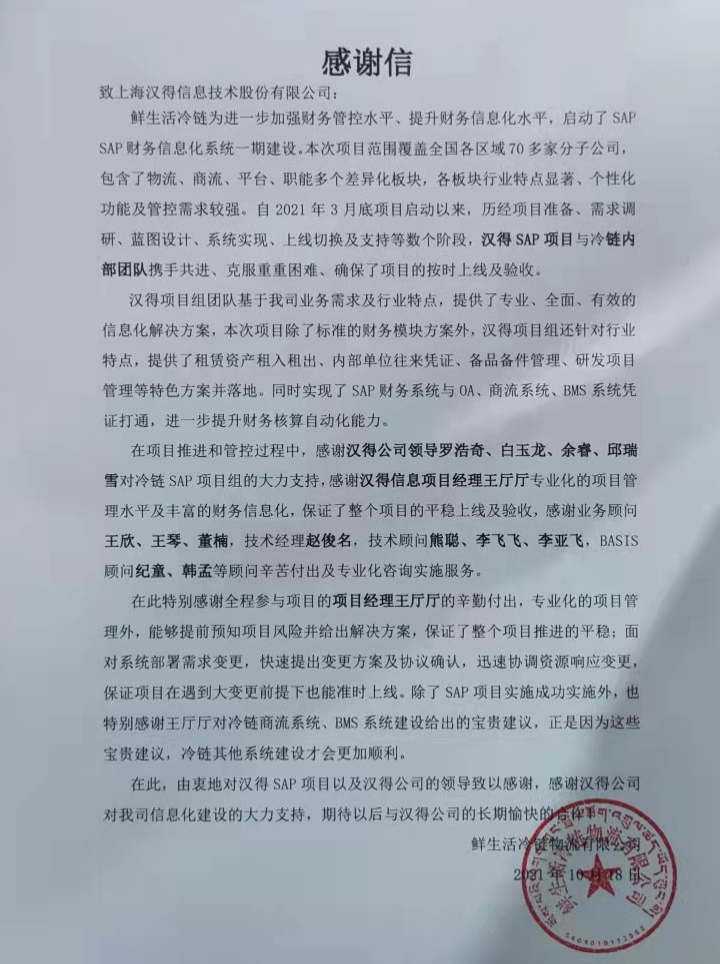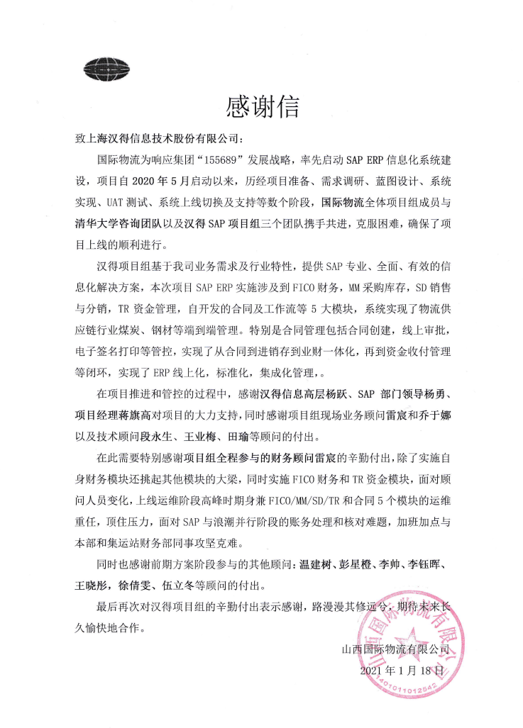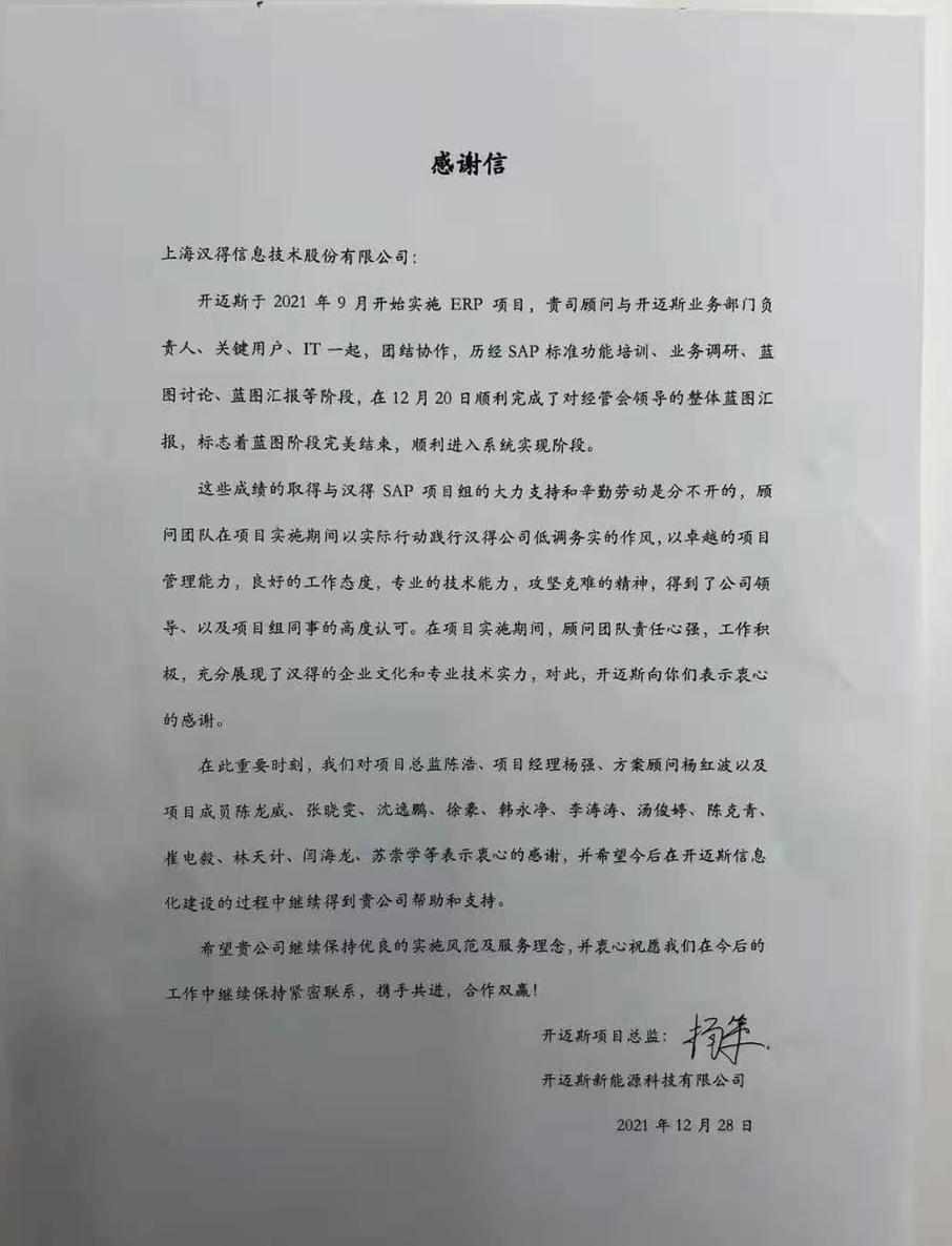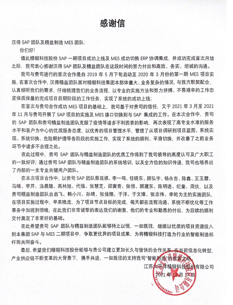 “过去一年,我们在陪伴企业数字化转型的道路上,坚持自主创新,努力自我进化,将服务能力‘进化’成更高形态。 当数字化领域不再有低垂的果实,面对企业在各领域数字化转型的复杂挑战和不确定性环境,能够互相支持,携手同行的唯有坚持长期开展、长远价值的伙伴。 士以弘毅,感怀重托长相伴;任重道远,励将荆棘踏坦途。 万象城AWC感怀客户重托,唯有不断努力超越自我,持续提升服务能力,在每一个客户的数字化转型项目上,坚持创造以‘软件工具扎根企业业务环境’的核心价值,以‘给予行业特征和管理经验的知识沉淀咨询服务’的形式价值,以‘陪伴企业持续进化促进变革发生’的情绪价值,感谢企业客户的信任托付!” —— SAP咨询服务事业部总经理 智协供应链事业部总经理 陆嫕颖 智协供应链 以下收录了部分客户感谢信 << 滑动查看下一封感谢信 >> 烽火通信 经过烽火通信项目组成员和万象城AWCSRM顾问团队共同奋斗,同心协力,顺利获得SRM项目重新梳理整合了采购管理业务流程,提升业务管理水平,提高烽火通信的信息化水平,从初夏到冬至,解决了一个又一个问题,度过了一个又一个难忘的日夜,项目组的辛苦我们看在眼里记在心上,随着烽火通信SRM项目逐步推进,现在处于系统上线准备的阶段。在此对于给予项目大力支持和付出辛勤劳动的顾问们表示由衷的感谢! 中电科电子装备 在中电科SRM项目实施过程中,万象城AWC顾问严谨、敬业的工作态度和高效专业的工作能力让我们印象深刻。展望未来,我们衷心希望能与贵公司一道紧密合作,与贵司建立更加长久而愉快的合作关系,共同向着助推中电科电子装备集团以及旗下子公司成为世界一流的行业领军企业的愿景前进! 一汽大众 我们一起见证了一汽-大众企业电子商城项目的每一个难忘瞬间及每一个里程碑的取得,借助企业电子商城平台我们有信心进一步提升MRO采购管理能力,全面提升信息化水平。经过商城项目的实施,对协议引入、商品管理、费用申请、预算控制、审批、下单等业务进行了全面的定制和开发,覆盖了一汽-大众MRO品类全部领域,显著提升了一般采购管理熊力,很多创新性解决方案的落地也极大地提高我司MRO各品类采购作业的效果。 昆山农商银行 经过这段时间和贵公司的合作,贵公司的SRM系统能够根据业务需求进行灵活调整,将系统功能与实际业务进行有效融合,将各部门的采购需求进行汇总和推进,实现了采购申请预算的跟踪和管控,将招投标流程标准化、规范化,并且顺利获得系统实现与供应商的线上对接,对于行方的供应链管理来说实现效率上的突破和流程上的创新。 华润九新药业 因为信任,所以同行。万象城AWC品质,九新见证。真挚感谢,辛劳付出。展望未来,共铸辉煌!贵司项目组顾问从实际业务需求出发,结合以往的实施经验,克服种种困难,给予优质专业的咨询服务和相应的解决方案,全方位、多视角应对我司的管理及业务变更,持续推进项目的实施与落地。顺利获得SRM平台的优化,提升合规的管理监控水平,加强合规的控制,提升合规整体运作效率。 润联科技 贵公司驻派润联采购团队的项目组成员,在我团队工作已经一年有余,贵公司顾问与我团队成员紧密配合、团结协作,在我司多个项目中均表现出超强的专业能力和敬业精神。 万家乐 项目团队成员本着高效、高质量完成的态度,协助快速解决项目中出现的问题,根据现场的实际情况,与信息部门和业务部门联系、沟通、讨论,及时给出解决方案,为项目的顺利进行给予先决条件,起到了很好的桥梁作用。 云南建投 由贵司负责实施的采购中台项目,在贵司的大力支持和双方项目组全体成员共同努力下,顺利完成一期终验。在2021年内也分别上线了分包一期项目以及各个期优化项目,也取得云上营家部门的一致好评! 盈峰环境 任务是艰巨的,过程是艰辛的,但是成果是显著的,项目组基于我司业务需求及行业特性,给予了专业全面有效的信息化解决方案,历经五个月的项目实施,成功搭建并正常推行SRM 2.0 平台,显著提升我司采购业务管理水平。 SAP咨询服务事业部 以下收录了部分客户感谢信 << 滑动查看下一封感谢信 >> 福玻斯 在项目实施过程中,万象城AWC团队与福玻斯各部门及高层领导都保持紧密联系,持续沟通,无论是调研阶段的现场走访,还是方案阶段的耐心讲解,都展现出专业的顾问素养以及高度的敬业精神。 国际物流 万象城AWC项目组基于我司业务需求及行业特性,给予SAP专业、全面、有效的信息化解决方案,本次项目SAP ERP实施实现了物流物流供应链行业煤炭、钢材等端到端管理。特别是合同管理实现了从合同到进销存到业财一体化,再到资金收付管理等闭环,实现ERP线上化,标准化,集成化管理。 国酿食品 本次SAP ERP实施建设起统一的业财一体化平台,顺利获得产供销计划联动,实现销售订单与需求计划,采购计划,生产计划的高度融合。感谢万象城AWC公司对我司信息化建设的大力支持,期待以后与万象城AWC公司的长期愉快的合作! 海正生物 海正生物SAP项目自正式启动以来,双方项目组全体成员朝夕相处、团结合作、努力拼搏,一起克服各种困难,从春天走到冬天,我们共同见证了一期、二期的每一个难忘瞬间。在项目周期紧张,任务重的情况下,万象城AWCSAP实施团队以专业的表现、敬业的态度、严谨的分析、细心的辅导,使