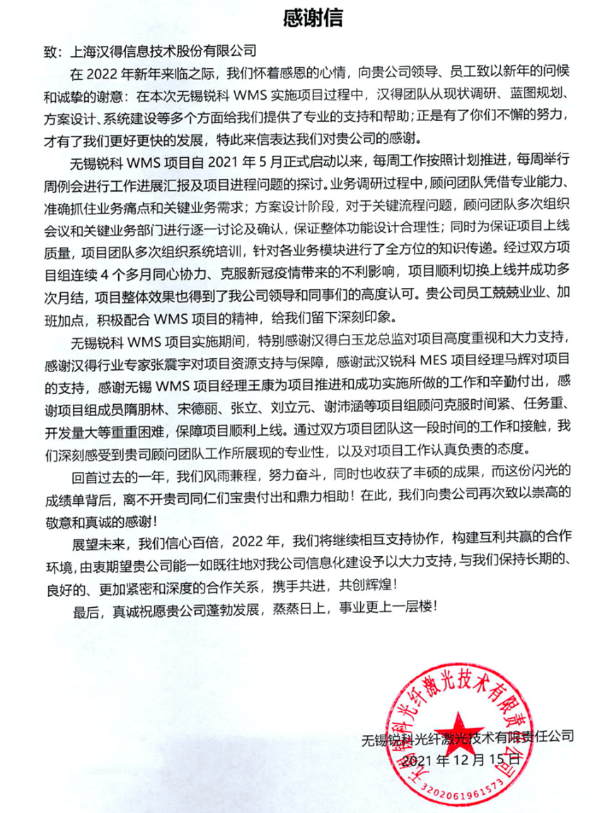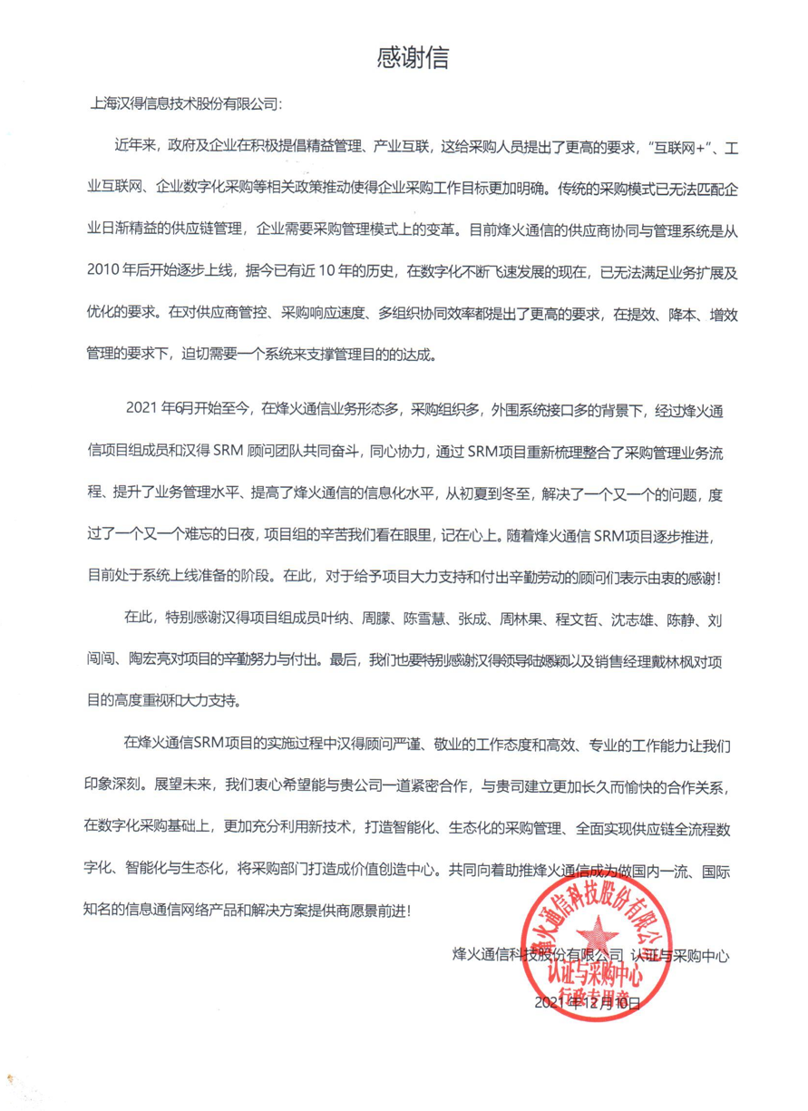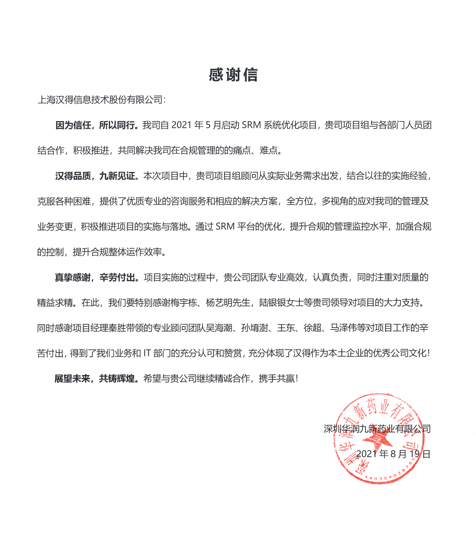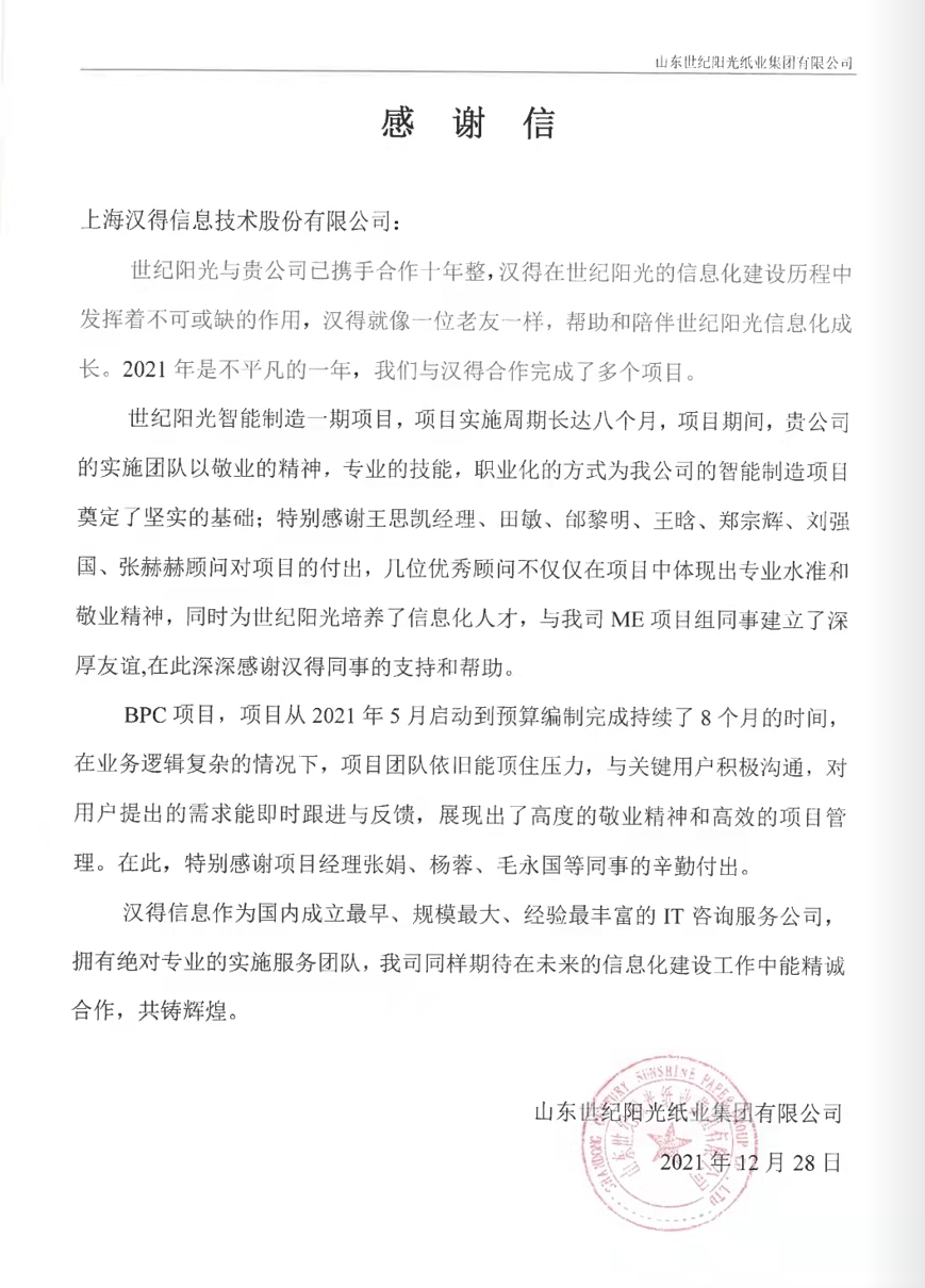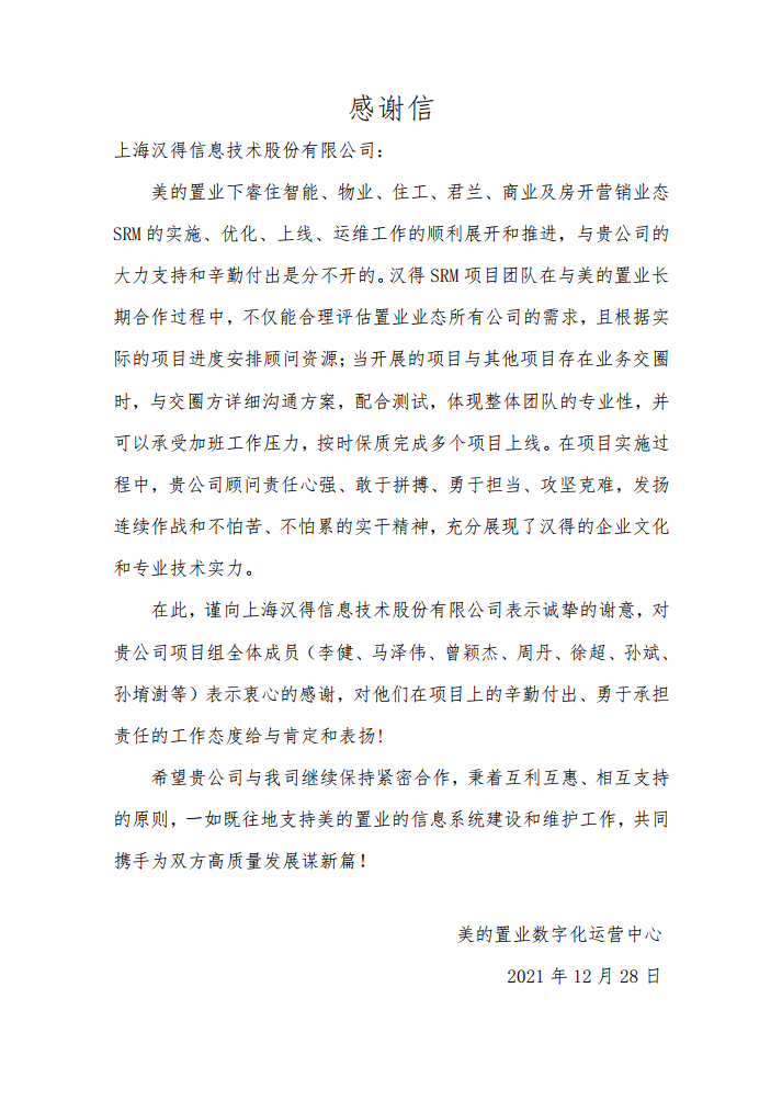 “过去一年,我们在陪伴企业数字化转型的道路上,坚持自主创新,努力自我进化,将服务能力‘进化’成更高形态。 当数字化领域不再有低垂的果实,面对企业在各领域数字化转型的复杂挑战和不确定性环境,能够互相支持,携手同行的唯有坚持长期开展、长远价值的伙伴。 士以弘毅,感怀重托长相伴;任重道远,励将荆棘踏坦途。 万象城AWC感怀客户重托,唯有不断努力超越自我,持续提升服务能力,在每一个客户的数字化转型项目上,坚持创造以‘软件工具扎根企业业务环境’的核心价值,以‘给予行业特征和管理经验的知识沉淀咨询服务’的形式价值,以‘陪伴企业持续进化促进变革发生’的情绪价值,感谢企业客户的信任托付!” —— SAP咨询服务事业部总经理 智协供应链事业部总经理 陆嫕颖 智协供应链 以下收录了部分客户感谢信 << 滑动查看下一封感谢信 >> 烽火通信 经过烽火通信项目组成员和万象城AWCSRM顾问团队共同奋斗,同心协力,顺利获得SRM项目重新梳理整合了采购管理业务流程,提升业务管理水平,提高烽火通信的信息化水平,从初夏到冬至,解决了一个又一个问题,度过了一个又一个难忘的日夜,项目组的辛苦我们看在眼里记在心上,随着烽火通信SRM项目逐步推进,现在处于系统上线准备的阶段。在此对于给予项目大力支持和付出辛勤劳动的顾问们表示由衷的感谢! 中电科电子装备 在中电科SRM项目实施过程中,万象城AWC顾问严谨、敬业的工作态度和高效专业的工作能力让我们印象深刻。展望未来,我们衷心希望能与贵公司一道紧密合作,与贵司建立更加长久而愉快的合作关系,共同向着助推中电科电子装备集团以及旗下子公司成为世界一流的行业领军企业的愿景前进! 一汽大众 我们一起见证了一汽-大众企业电子商城项目的每一个难忘瞬间及每一个里程碑的取得,借助企业电子商城平台我们有信心进一步提升MRO采购管理能力,全面提升信息化水平。经过商城项目的实施,对协议引入、商品管理、费用申请、预算控制、审批、下单等业务进行了全面的定制和开发,覆盖了一汽-大众MRO品类全部领域,显著提升了一般采购管理熊力,很多创新性解决方案的落地也极大地提高我司MRO各品类采购作业的效果。 昆山农商银行 经过这段时间和贵公司的合作,贵公司的SRM系统能够根据业务需求进行灵活调整,将系统功能与实际业务进行有效融合,将各部门的采购需求进行汇总和推进,实现了采购申请预算的跟踪和管控,将招投标流程标准化、规范化,并且顺利获得系统实现与供应商的线上对接,对于行方的供应链管理来说实现效率上的突破和流程上的创新。 华润九新药业 因为信任,所以同行。万象城AWC品质,九新见证。真挚感谢,辛劳付出。展望未来,共铸辉煌!贵司项目组顾问从实际业务需求出发,结合以往的实施经验,克服种种困难,给予优质专业的咨询服务和相应的解决方案,全方位、多视角应对我司的管理及业务变更,持续推进项目的实施与落地。顺利获得SRM平台的优化,提升合规的管理监控水平,加强合规的控制,提升合规整体运作效率。 润联科技 贵公司驻派润联采购团队的项目组成员,在我团队工作已经一年有余,贵公司顾问与我团队成员紧密配合、团结协作,在我司多个项目中均表现出超强的专业能力和敬业精神。 万家乐 项目团队成员本着高效、高质量完成的态度,协助快速解决项目中出现的问题,根据现场的实际情况,与信息部门和业务部门联系、沟通、讨论,及时给出解决方案,为项目的顺利进行给予先决条件,起到了很好的桥梁作用。 云南建投 由贵司负责实施的采购中台项目,在贵司的大力支持和双方项目组全体成员共同努力下,顺利完成一期终验。在2021年内也分别上线了分包一期项目以及各个期优化项目,也取得云上营家部门的一致好评! 盈峰环境 任务是艰巨的,过程是艰辛的,但是成果是显著的,项目组基于我司业务需求及行业特性,给予了专业全面有效的信息化解决方案,历经五个月的项目实施,成功搭建并正常推行SRM 2.0 平台,显著提升我司采购业务管理水平。 SAP咨询服务事业部 以下收录了部分客户感谢信 << 滑动查看下一封感谢信 >> 福玻斯 在项目实施过程中,万象城AWC团队与福玻斯各部门及高层领导都保持紧密联系,持续沟通,无论是调研阶段的现场走访,还是方案阶段的耐心讲解,都展现出专业的顾问素养以及高度的敬业精神。 国际物流 万象城AWC项目组基于我司业务需求及行业特性,给予SAP专业、全面、有效的信息化解决方案,本次项目SAP ERP实施实现了物流物流供应链行业煤炭、钢材等端到端管理。特别是合同管理实现了从合同到进销存到业财一体化,再到资金收付管理等闭环,实现ERP线上化,标准化,集成化管理。 国酿食品 本次SAP ERP实施建设起统一的业财一体化平台,顺利获得产供销计划联动,实现销售订单与需求计划,采购计划,生产计划的高度融合。感谢万象城AWC公司对我司信息化建设的大力支持,期待以后与万象城AWC公司的长期愉快的合作! 海正生物 海正生物SAP项目自正式启动以来,双方项目组全体成员朝夕相处、团结合作、努力拼搏,一起克服各种困难,从春天走到冬天,我们共同见证了一期、二期的每一个难忘瞬间。在项目周期紧张,任务重的情况下,万象城AWCSAP实施团队以专业的表现、敬业的态度、严谨的分析、细心的辅导,使