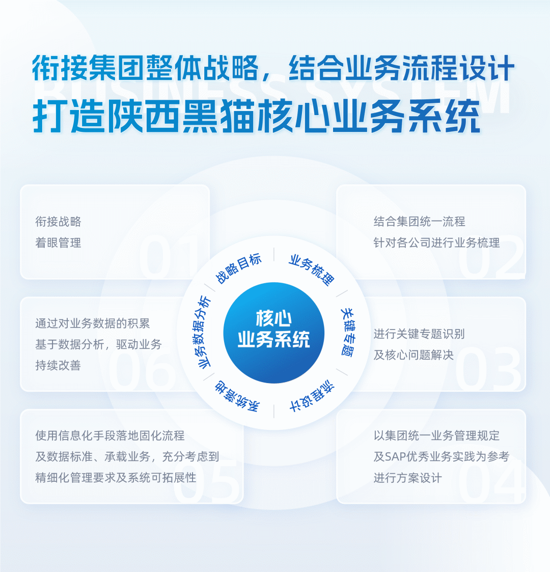 顺利获得系统实施,并结合SAP行业优秀实践与黑猫业务实况,建立一套完整、标准化的业务蓝图模板,将流程进行系统固化,切实提升集团的业务规范程度和管控能力。