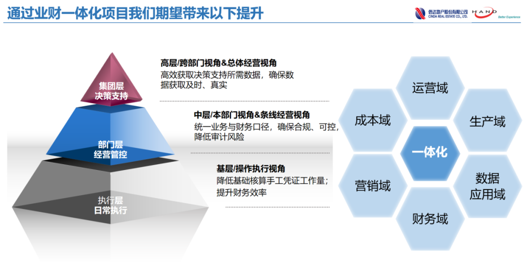 以业财一体为基础,项目运营为主线,有助于各专业有效交圈,逐步实现流程、数据的标准化、集成和优化;