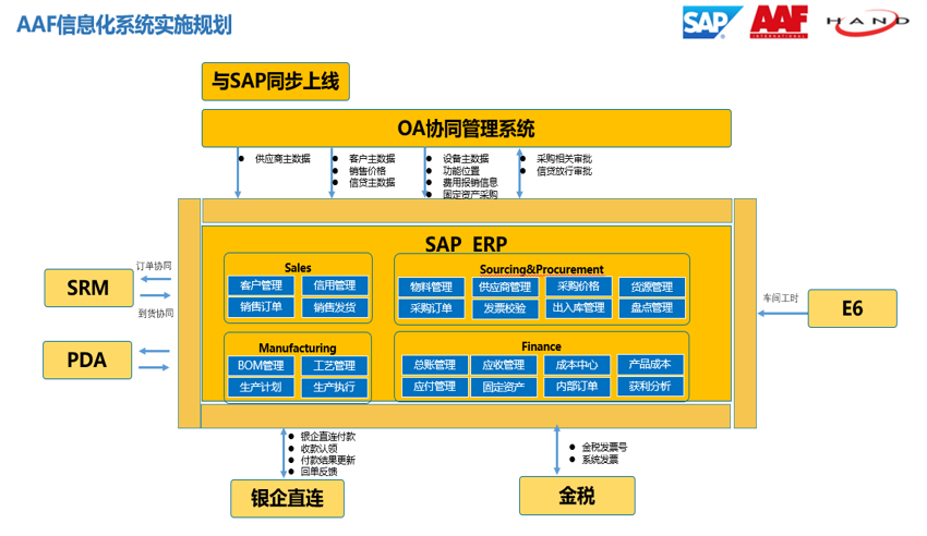 “使用SAP ERP云产品后,帮助AAF优化核心业务流程,提升流程自动化水平,加强计划、生产、采购、仓储、销售各环节业务衔接,优化企业内部供应链体系,提高交付水平和准确性。同时实现业财一体化管理,发挥财务在业务召开过程中的核算和监督作用,帮AAF实现PDA、条码、防伪功能、车间员工报工等个性化的开发需求,淘汰掉原有的E6,卷号录入系统,并与各外围系统集成,打通业务流程数据,实现数据共享。”