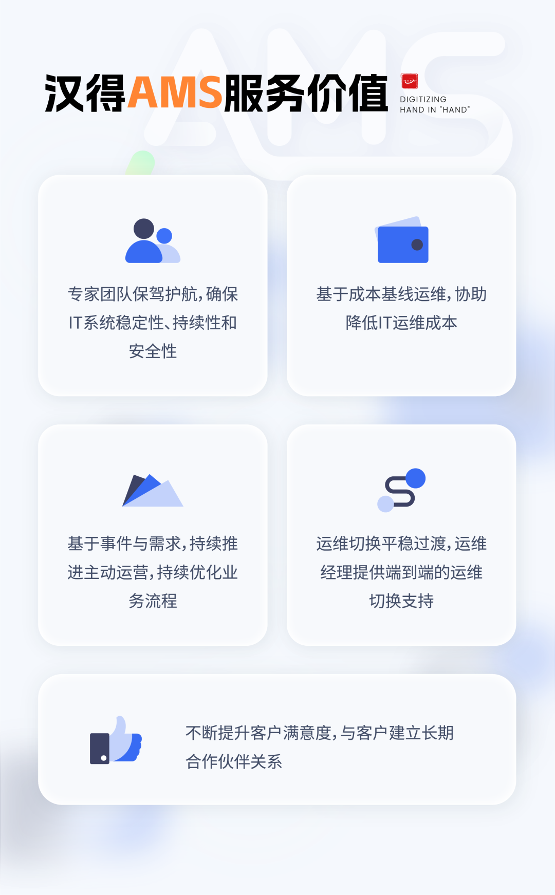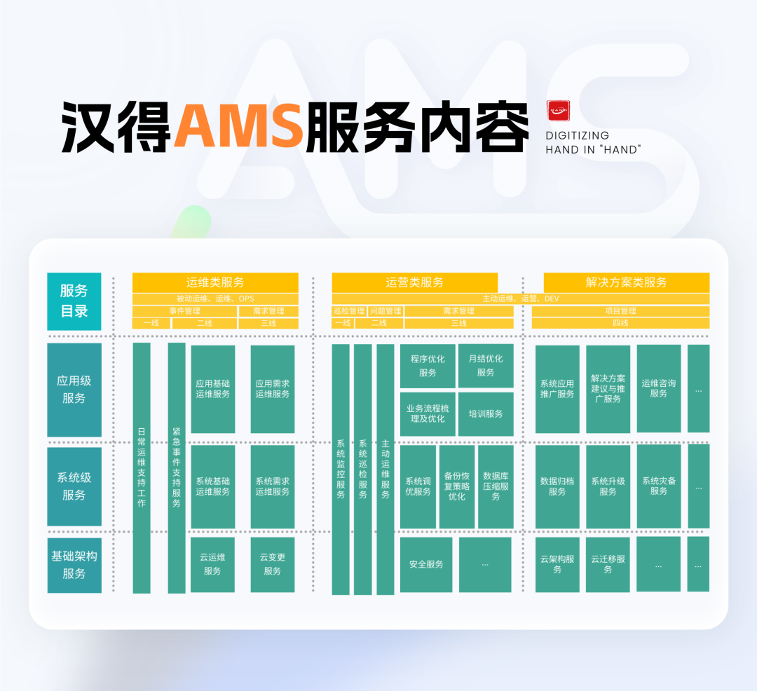 万象城AWCAMS(应用管理服务中心)面向全球企业努力构建专业的IT系统运营中心,采用数字运营理念,区域化组织运作,自主研发运维平台,搭建完善的运维体系,给客户给予基础设施层、系统层和应用层等一站式系统运营及托管服务。