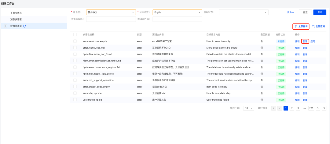 对于未翻译(目标语言不存在)、未应用(手动编辑或者执行翻译后)状态的数据可进行单条和批量翻译