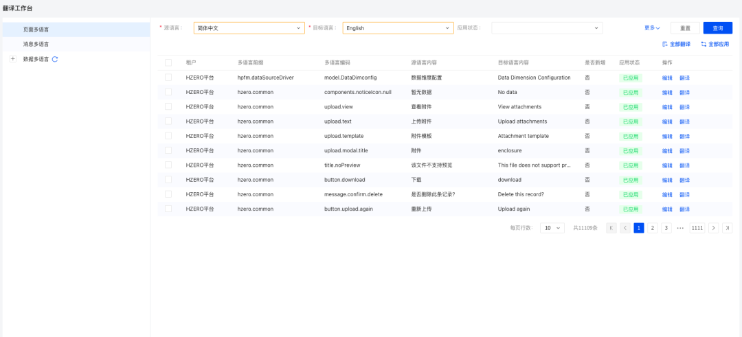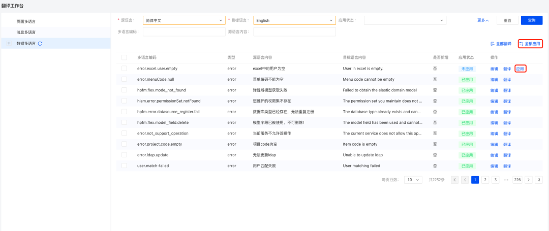 对于未应用(手动编辑或者执行翻译后)的数据可进行单条和批量应用。 应用后状态变为已应用,对应目标多语言数据会动态入库