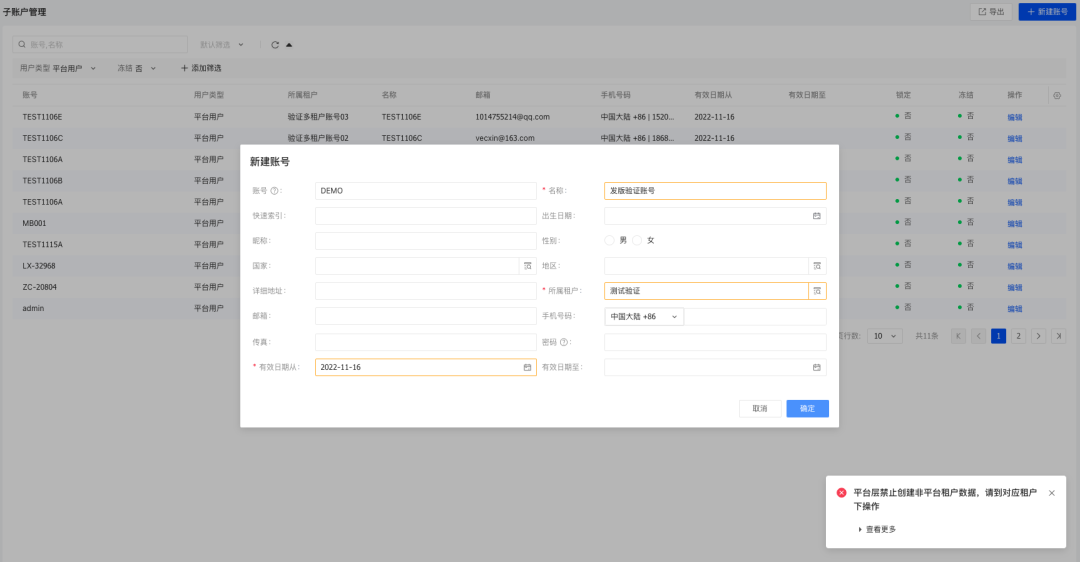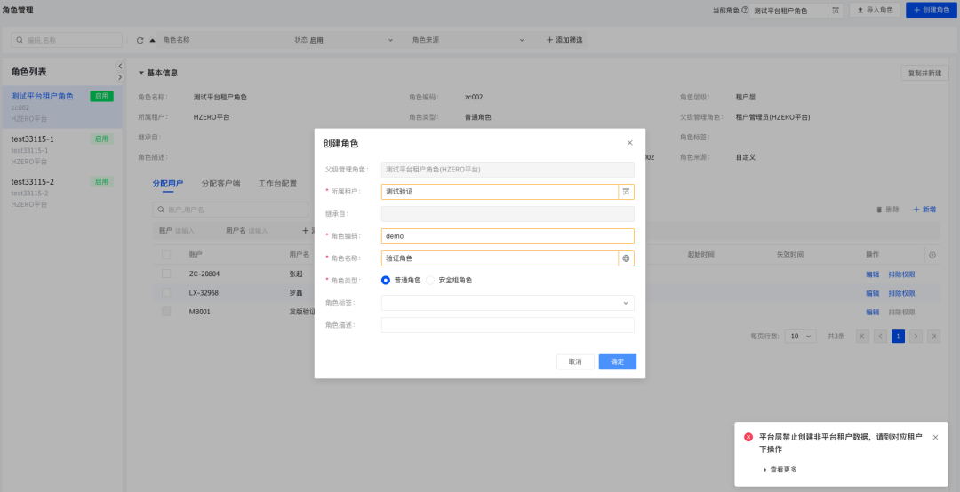 新增平台级不允许创建租户的用户、角色等信息的配置