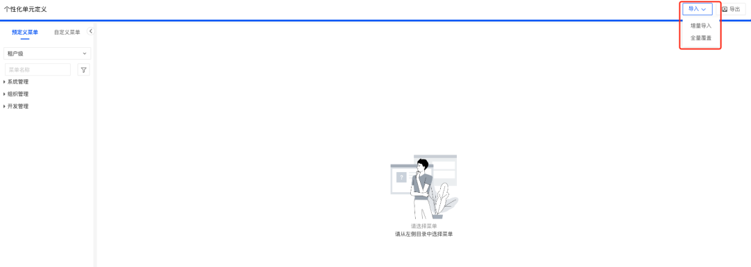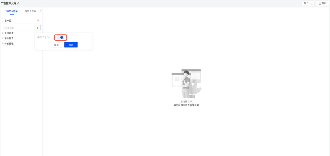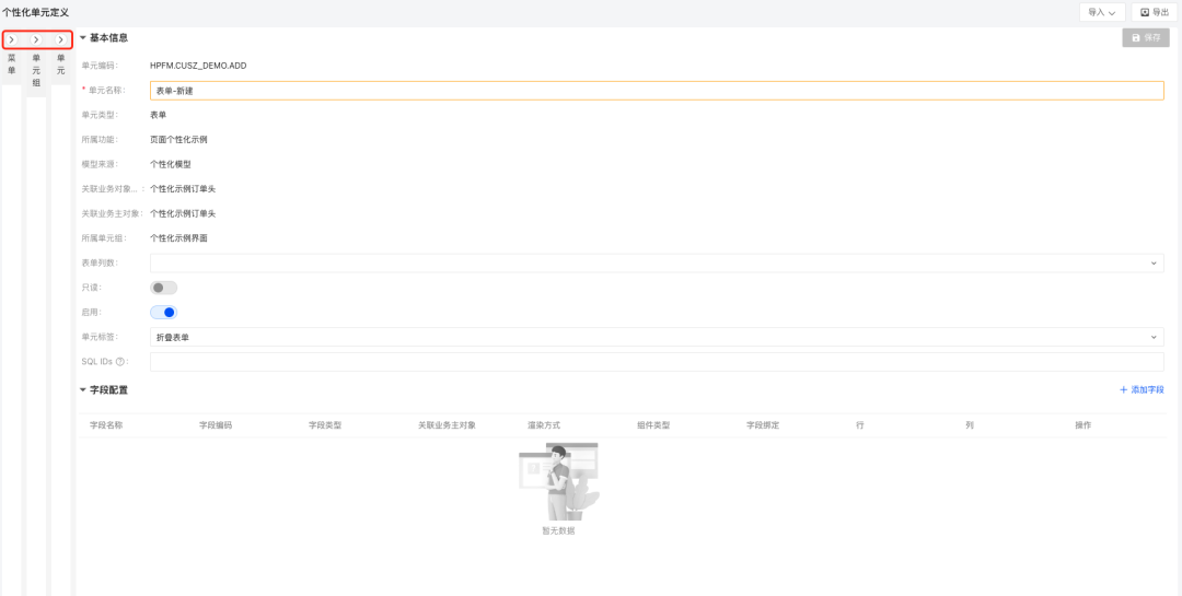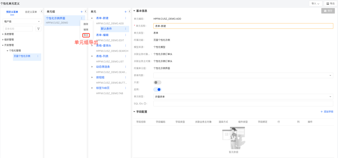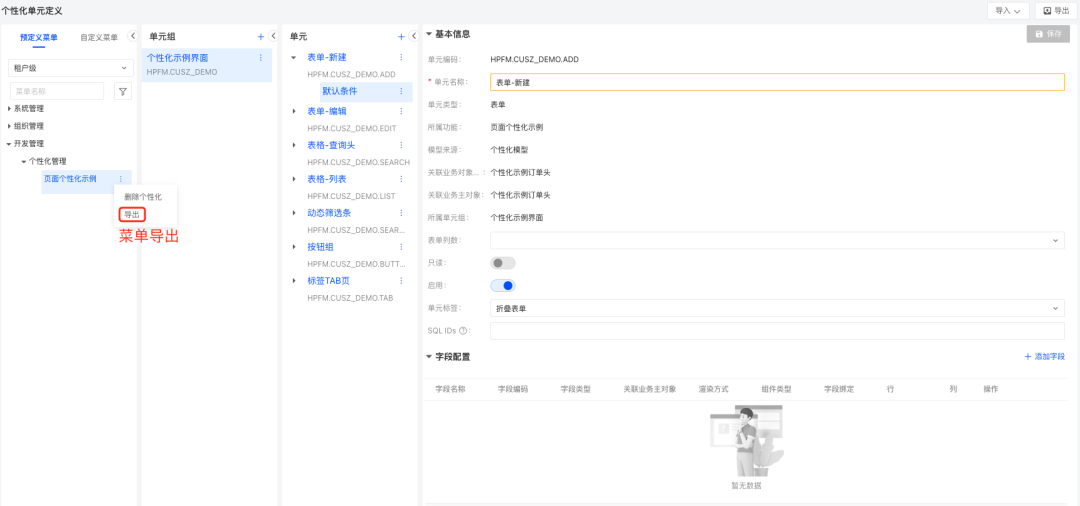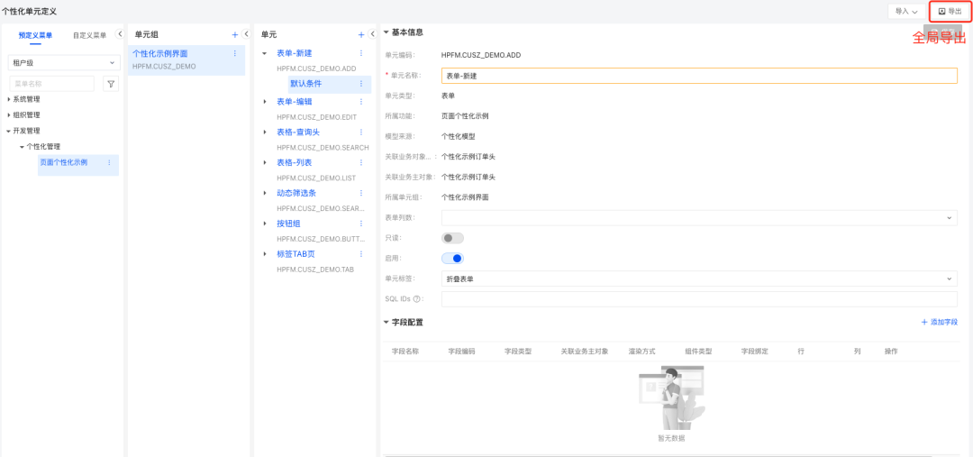 模型导入导出:为了方便项目开发人员在不同环境之间进行数据迁移,页面个性化模型给予了数据导入导出的功能