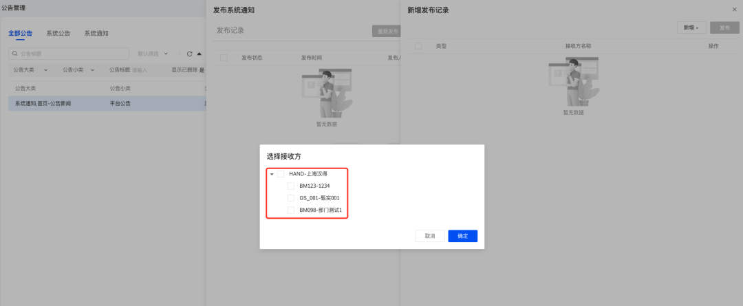 新增公告/通知指定部门发送时,支持选择是否发送子部门