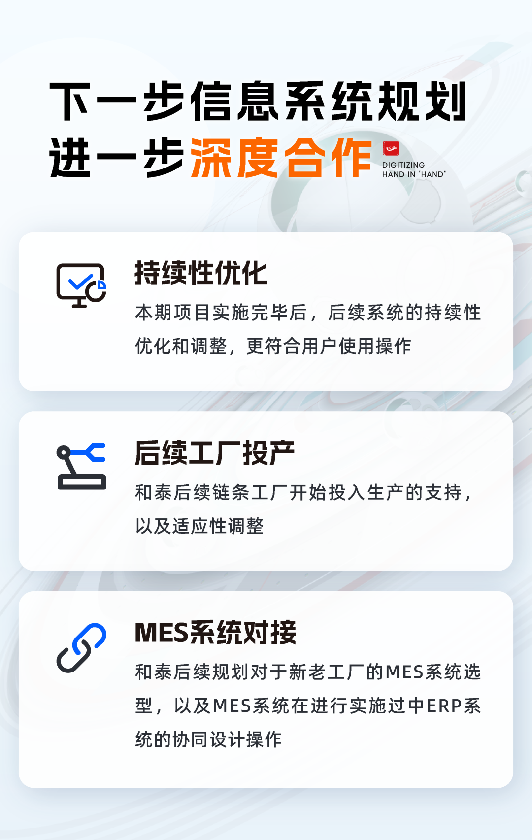 “顺利获得此次SAP的实施,基本实现本次项目期初确定的重点项,顺利获得此次一体化信息系统建设项目形成和泰机电产品业态。我们希望系统既要具备实现流程标准化,业务、财务一体化,业务闭环的能力,并且要能支撑到企业对于营运数据和智能数据的透明化管理,从而实现实际成本的成本核算管理,仓库收发料的条码化管理,便捷即时的生产工序报工管理,并能顺利获得ERP系统实现粗排产管理。提质增效,实现订单的敏捷交付,为我们企业给予管理的提效。”
