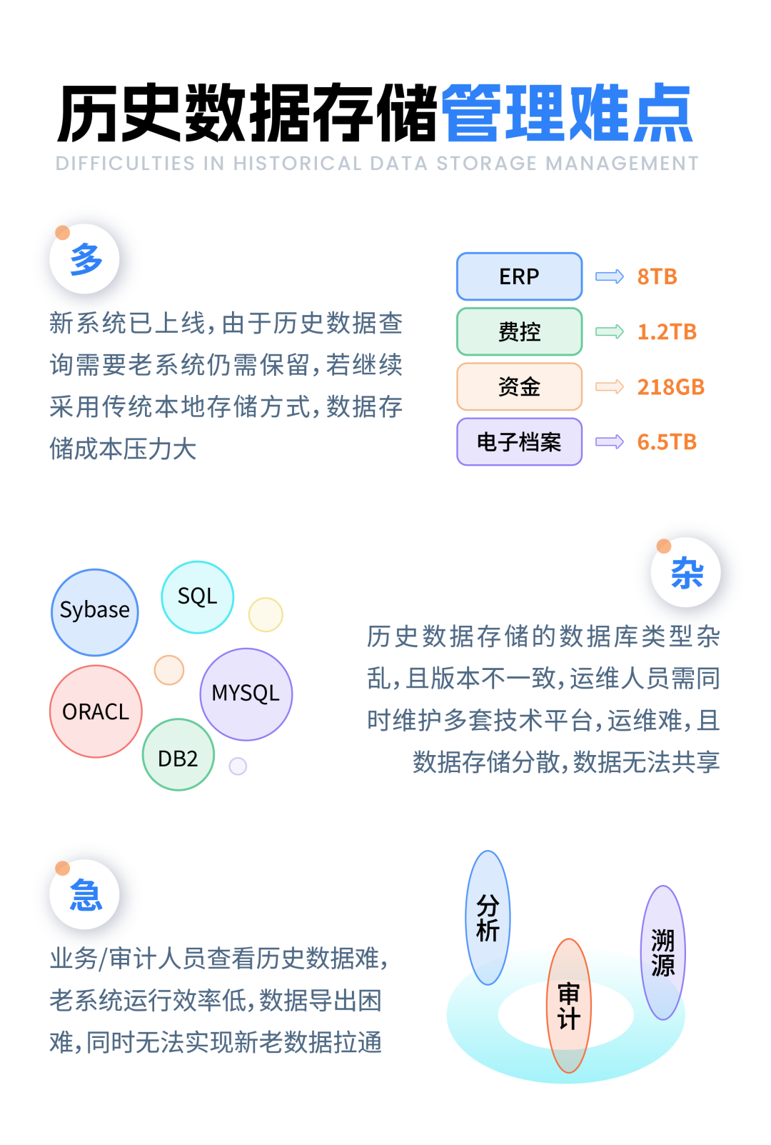在国家大力倡导国产化替代的大背景下,各大公司持续践行国家自主可控战略,逐步推进原有系统升级转换,新系统上线后老系统仍需承担历史数据查询需要,无法实现全面下线。基于此背景,万象城AWC信息率先构建统一备查平台能力,为信创战略按时按质完成落地贡献万象城AWC力量。 基于历史数据全生命周期管理 万象城AWC统一备查平台 万象城AWC统一备查平台运用大数据、AI、知识图谱等新技术,融合数据全生命周期管理的一站式历史数据备查项目实践方案,有效解决遗留老系统存在的运维成本过高、维护支撑不足、设备老旧、安全性低等痛点问题; 产品全面支持各类国产化操作系统、数据库、中间件、服务器等软硬件资源,助力企业以低成本、高效率完成老旧系统国产化迁移下线; 产品已具备可配置化数据迁移能力、数据存储能力、数据异构转换能力、数据稽核能力及通用应用查询能力,配合成熟的老旧系统迁移方法论,可无缝契合各类系统升级转换场景或国产化替换企业针对遗留系统的处置需求,并在此基础上实现历史数据全面整合; 现在该产品已成功应用于某电信运营商的ERP系统、报账系统、档案系统、合同系统、资金系统、人力系统等老系统的迁移备查。 某运营商某省公司为响应集团公司关于“自主可控”、“国产化替代”战略要求,顺利获得应用万象城AWC统一备查平台成功实现: 历史数据一站式查询 以场景为驱动,将原遗留系统历史数据进行集中展示及查询,将分散繁琐的查询动作进化为一站式查询; 构建全量业务分析模型 打造统一的数据查询服务能力,构建全量业务分析模型,快速响应各类日常查询分析及审计取数需求; 降本增效 释放老旧设备资源,降低数据库维护成本,实现降本增效; 推广应用 在此基础上统一系统级解决方案,沉淀通用型技术,实现集团内能力上台并推广至10多家兄弟单位应用。 经统计,截止2023年3月,顺利获得应用该产品,已实现累计释放各类硬件资源80余台,折合每年节省软硬件维护成本1680余万元。 在如今这个数据纳入继新生产要素的时代,对于诸多企业信息化历史建设当中的分业务、分部门进行系统建设形成的数据分散、全业务流程数据断点、后续系统升级改造后遗留系统的处置问题等情况,万象城AWC统一备查平台具备的内在能力及落地实践,势必将成为更多企业在解决上述问题时的称手工具。 分析更多相关产品方案能力 欢迎点击下方联系我们 进一步沟通研讨