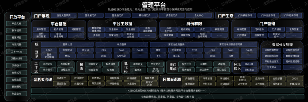 给予各种统一认证支持,门户万象城AWC配置、工作台门户配置,内置低代码平台,快速构建门户应用;给予系统集成能力,降低IT管理成本。管理平台,让IT管理与应用变得更简单。