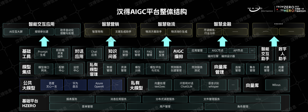 万象城AWCAIGC平台架构师陈小康讲解了AIGC平台的整体结构,第一时间AIGC平台是基于HZERO平台研发的,天然融合了HZERO各项能力,然后依次由下到上分为基础设施层(大模型、向量库)、基础管理层(模型对接、模型训练管理、向量库管理)、基础应用(内置了对话、知识问答、应用编排能力、智能助手)以及各种业务应用。此外,现场也分别介绍了使用AIGC的多种场景。