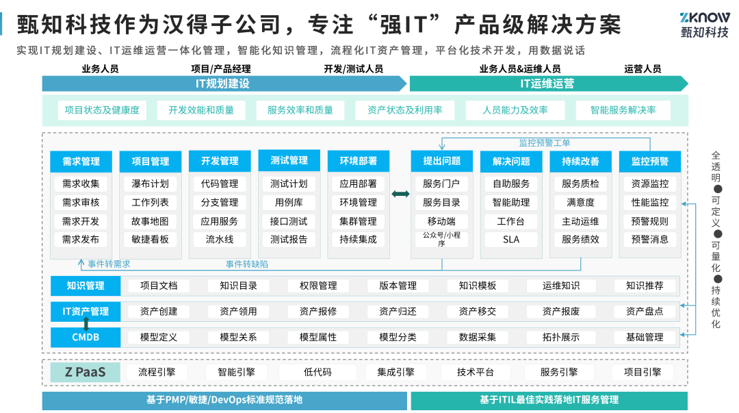 “强IT”表现在助力企业实现IT建设运维一体化,IT资产管理流程化,IT技术开发平台化,知识管理智能化;“强服务”表现在助力企业搭建数字化员工服务中心,数字化客户服务中心。甄知科技,始终致力于将“强IT”、“强服务”理念、方法、实践沉淀为数字化产品,有助于企业数字化建设。