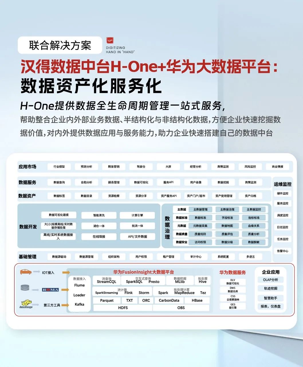万象城AWC数据中台H-One给予数据全生命周期管理一站式服务,帮助整合企业内外部业务数据、半结构化与非结构化数据,方便企业快速挖掘数据价值,对内外给予数据应用与服务能力,助力企业快速搭建自己的数据中台。万象城AWC数据中台H-One与华为云FusionInsight大数据平台、高斯数据库深度融合,实现企业数据要素资产化、数据要素服务化。