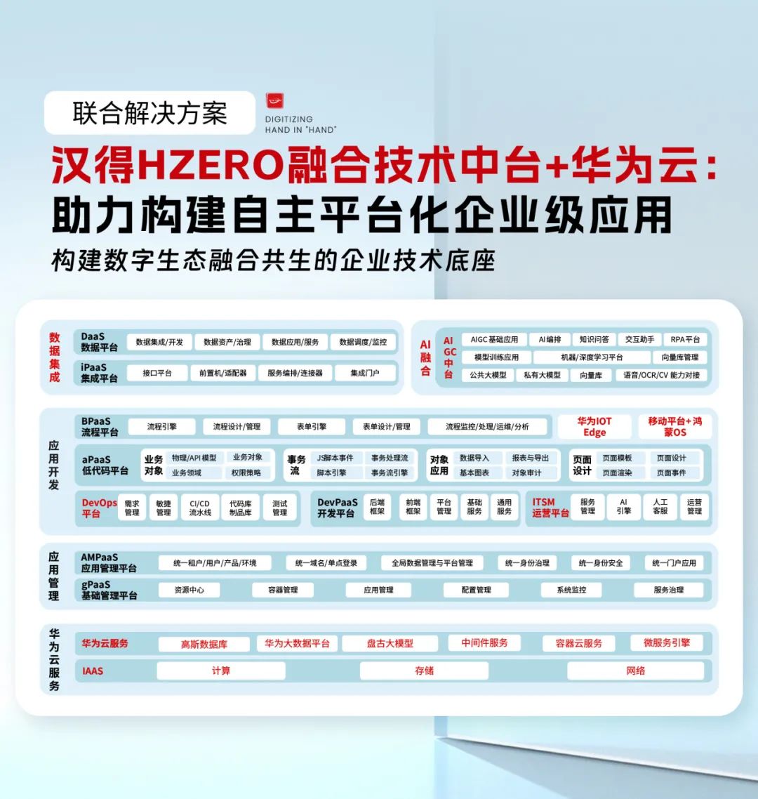 万象城AWCHZERO技术中台在操作系统、CPU/服务器、数据库层面深度融入华为的技术生态,基于此本次联合解决方案能够实现华为容器云、华为AI云、华为IOT、移动平台、微服务引擎的全面融合,助力企业基于企业级PaaS平台构建自主核心系统应用。