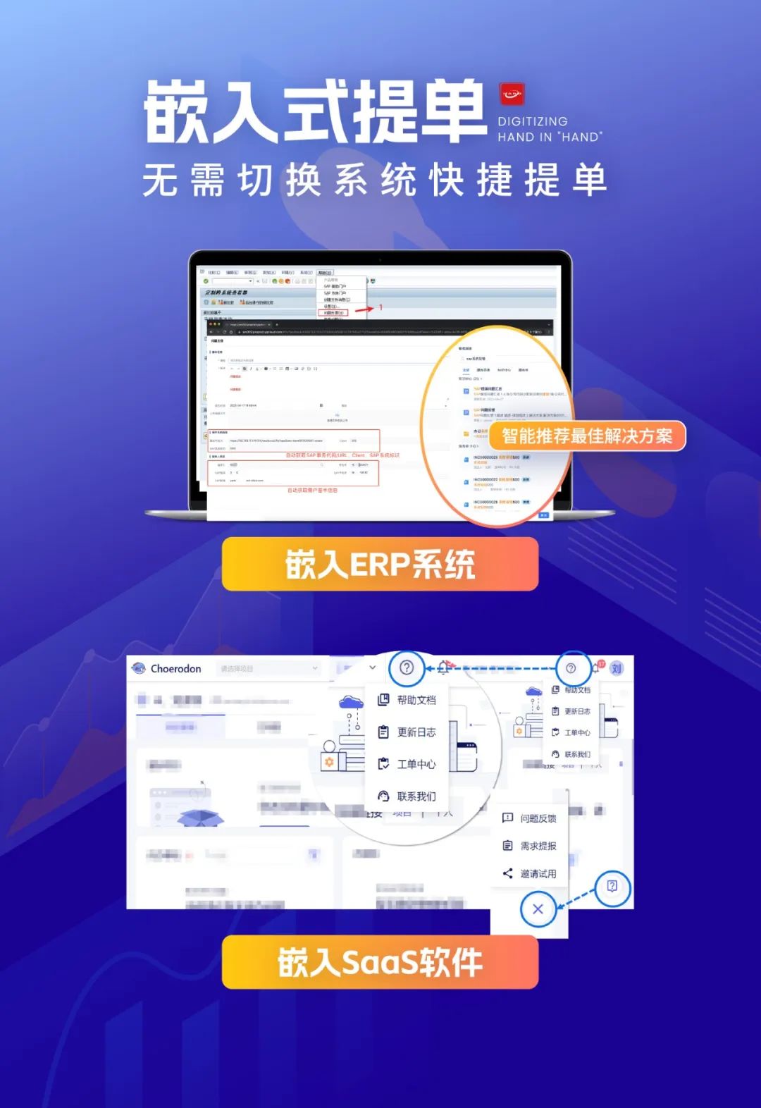 燕千云嵌入式应用是为了更方便地解决企业在使用其它软件或系统时遇到的问题而设计。传统的提单方式可能需要用户从一个系统跳转到另一个系统,或者进行多步操作。