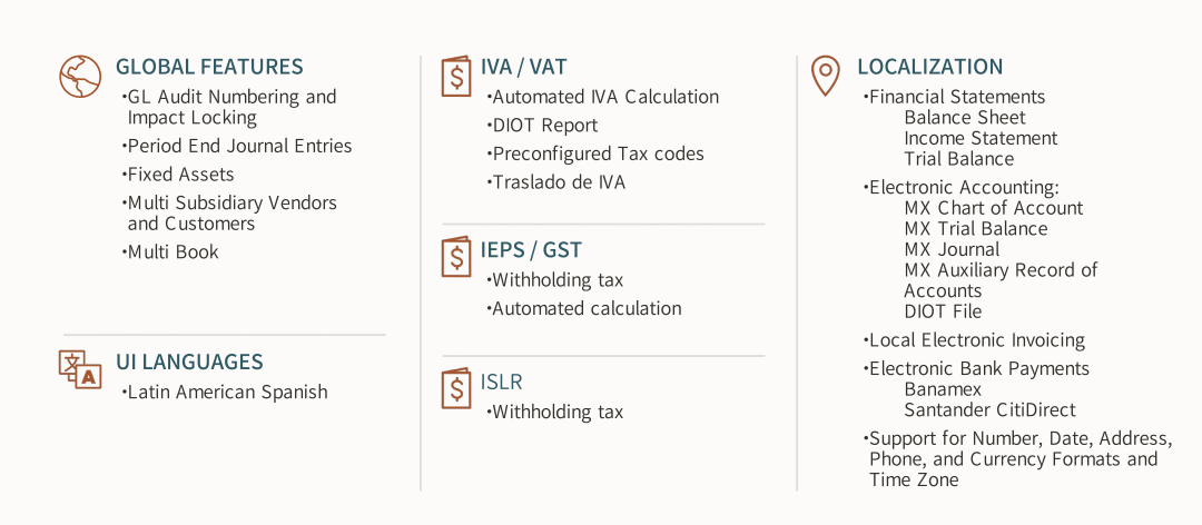 支持收付实现制的增值税,以及预扣税等墨西哥本地税务管理,支持DIOT等税务相关报表